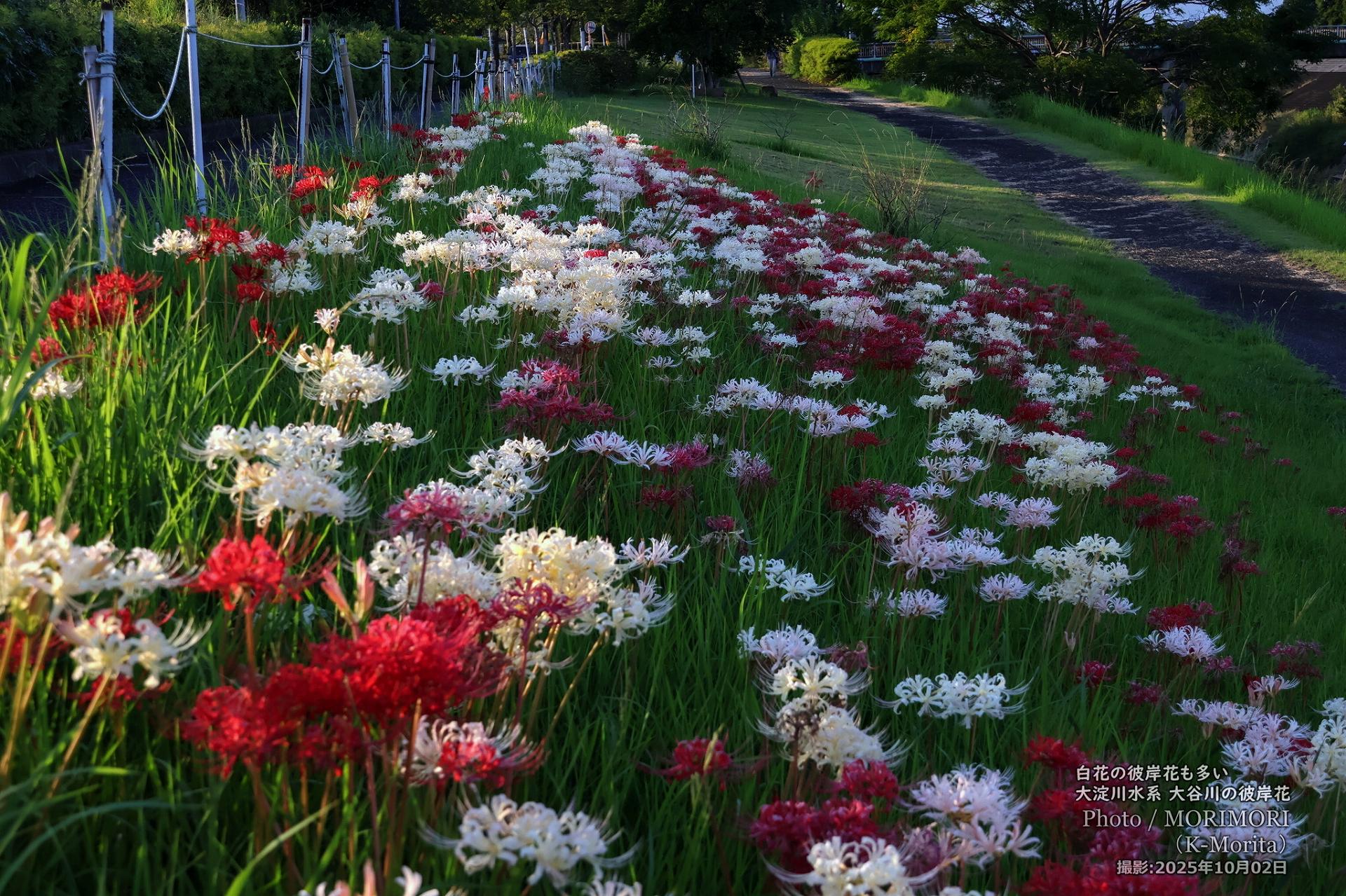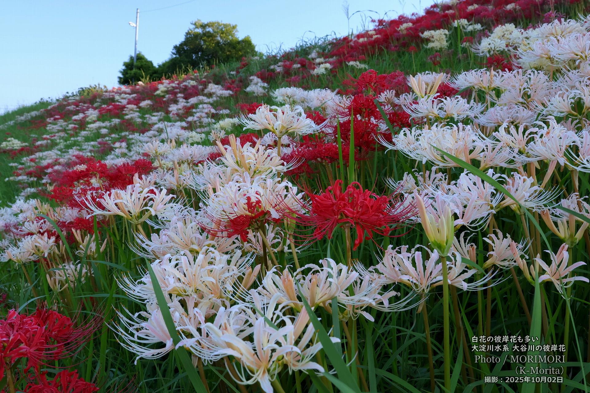 毎年見学に訪れている大淀川水系「大谷川」堤防の彼岸花が今年も紅白咲き揃いました。