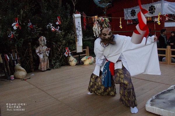 野島神楽は古くより加江田神社と共演していたようですが、寛文2年(1662年)の外所((どんどころ))地震以降、野島に残り舞い継がれています。現在、33番のうち22番程が伝承されています。