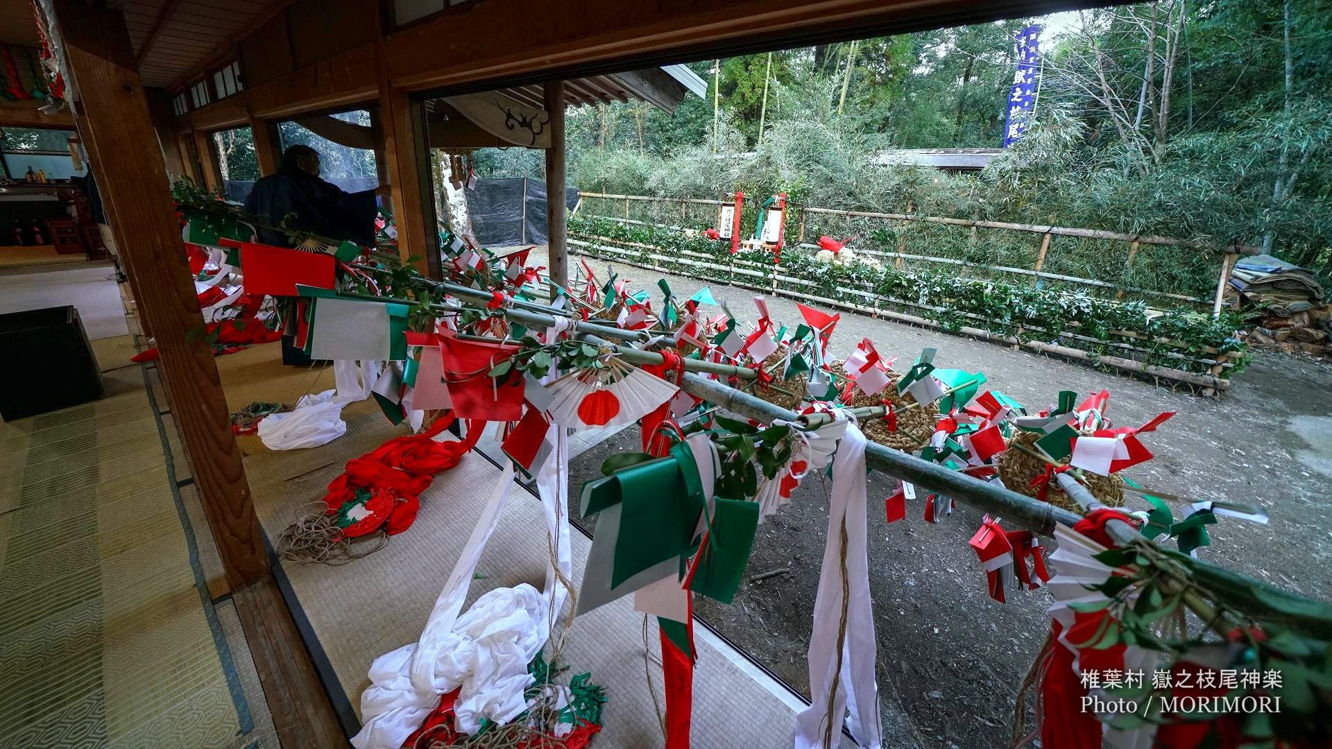 今年の「嶽之枝尾神楽」は、椎葉村南部、小崎川流域に位置する、竹の枝尾日当に鎮座する嶽之枝尾神社で行われました。以前は、3集落の民家の輪番制で行われていたようですが、昭和43年(1968年)に嶽之枝尾神社の舞殿を改築してからは、ほぼ、嶽之枝尾神社で奉納されているようですが、見学を予定される際には、その年の奉納場所の再確認をお願いします。