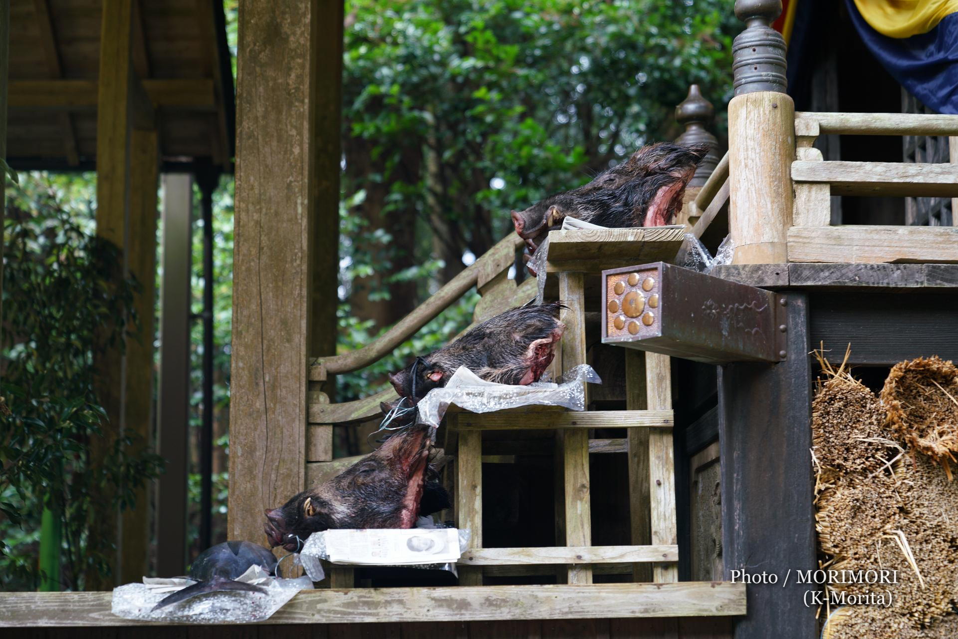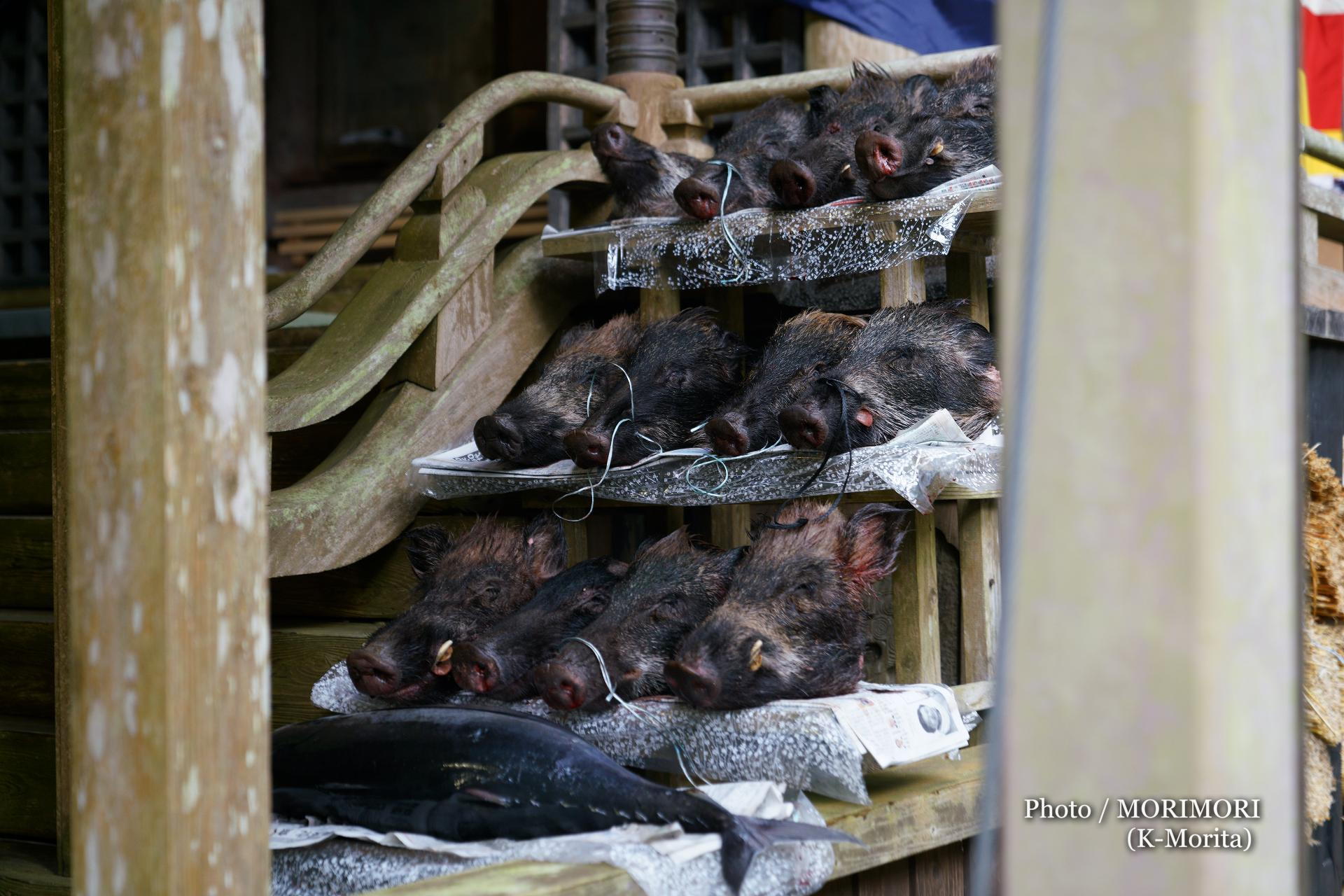 供えられた、海の幸である鮪や山の幸であるイノシシの頭
