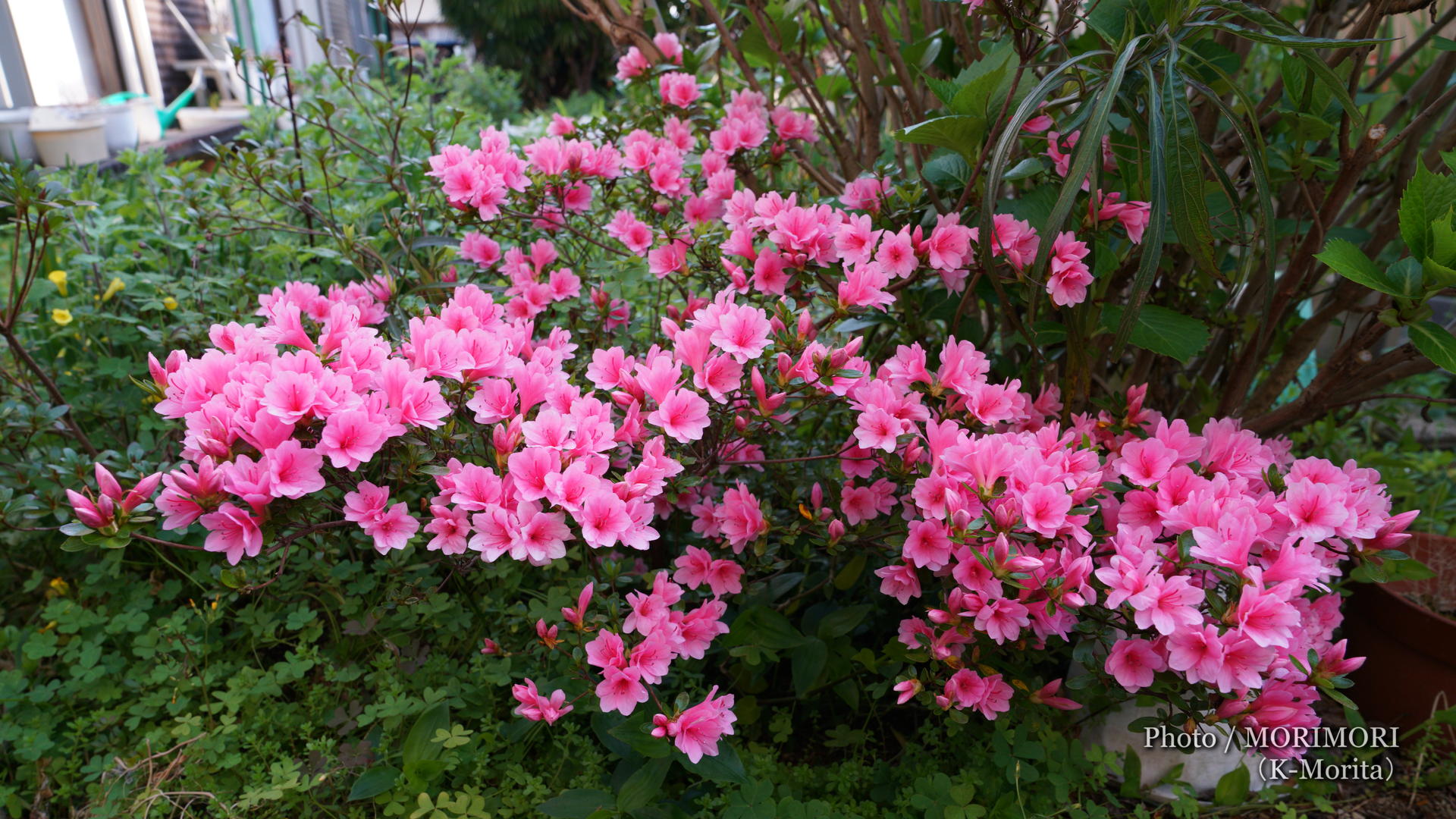5年前、「椎葉平家まつり]に出かけた際、椎葉村の「緑の少年団]が、街頭で募金を募っておりましたので、少しだけですが、協力したところ、背丈15cm位のツツジのポット苗木を頂き、育てています。そのツツジが今年も満開になりました。