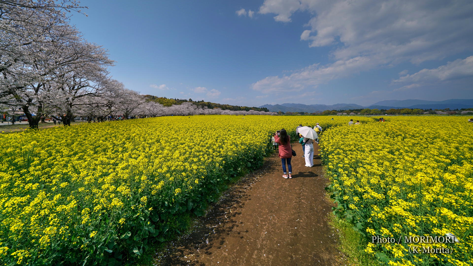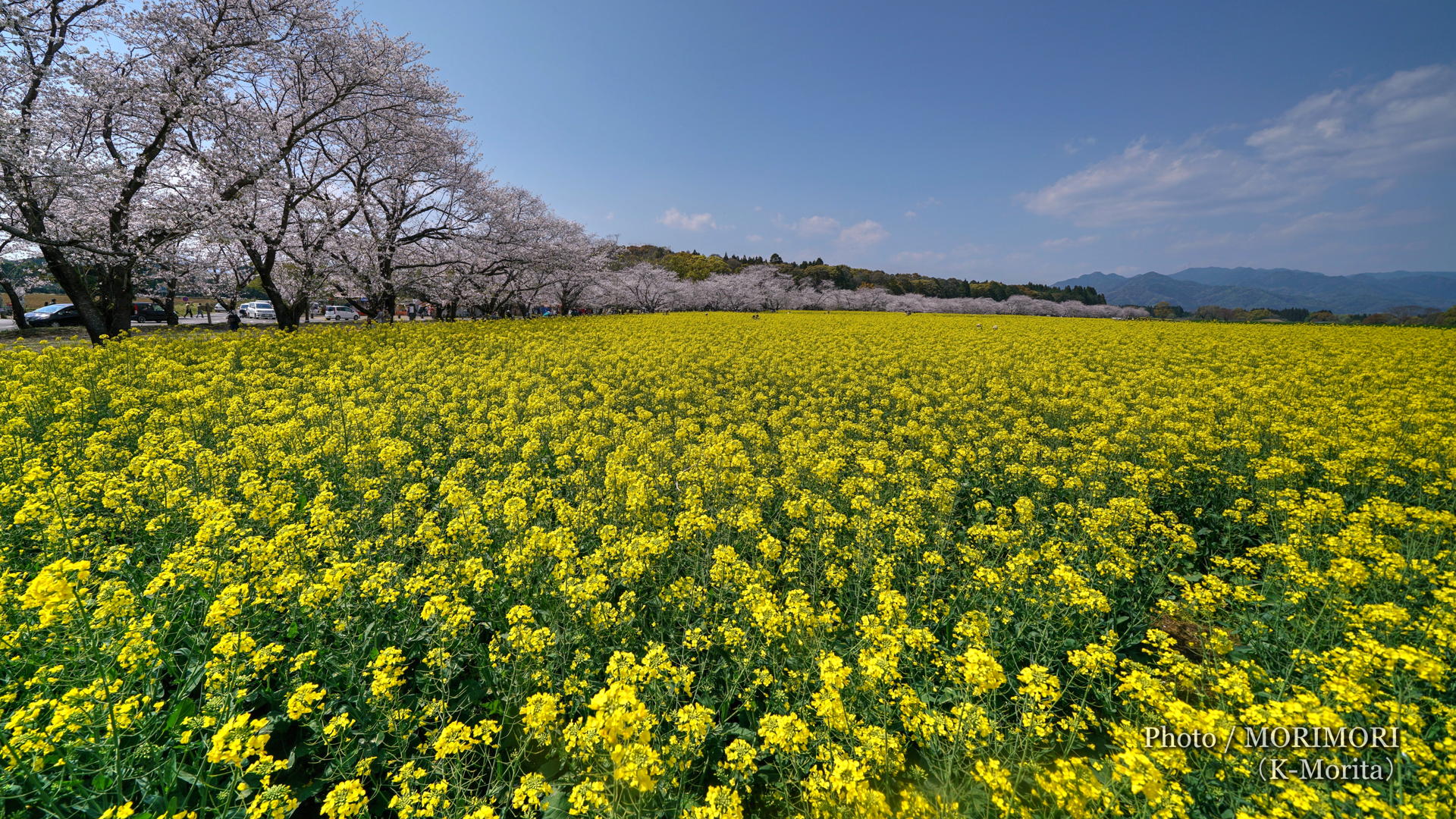 菜の花畑に沿って約800m続く桜並木の下は絶好のお花見ポイントお弁当を、持って出かけてはいかがでしょう。