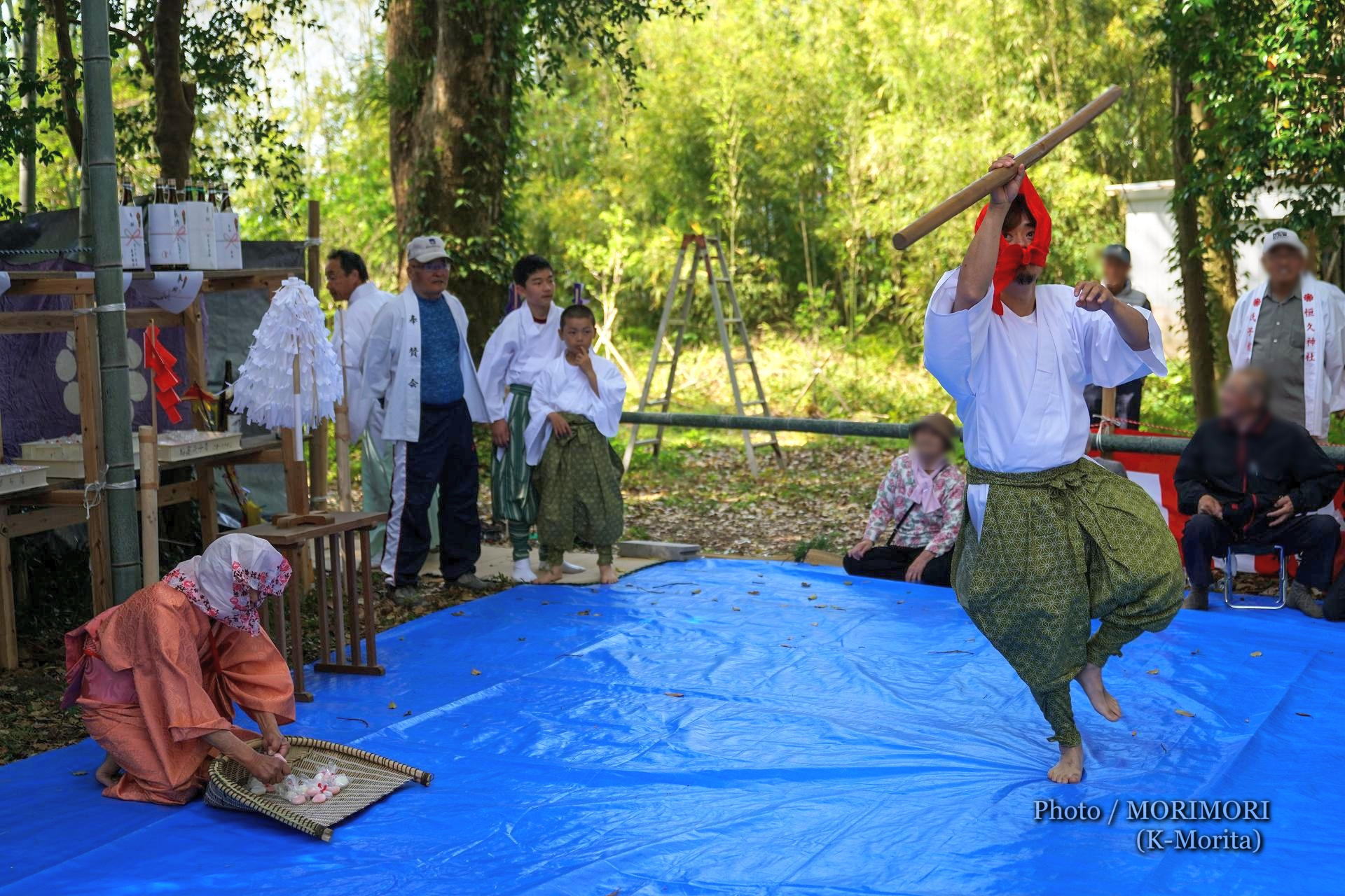 - 「楽」は、社殿側に太鼓と笛、ほぼ太鼓だけで、「嫁所面」の時だけ笛が入りました。
