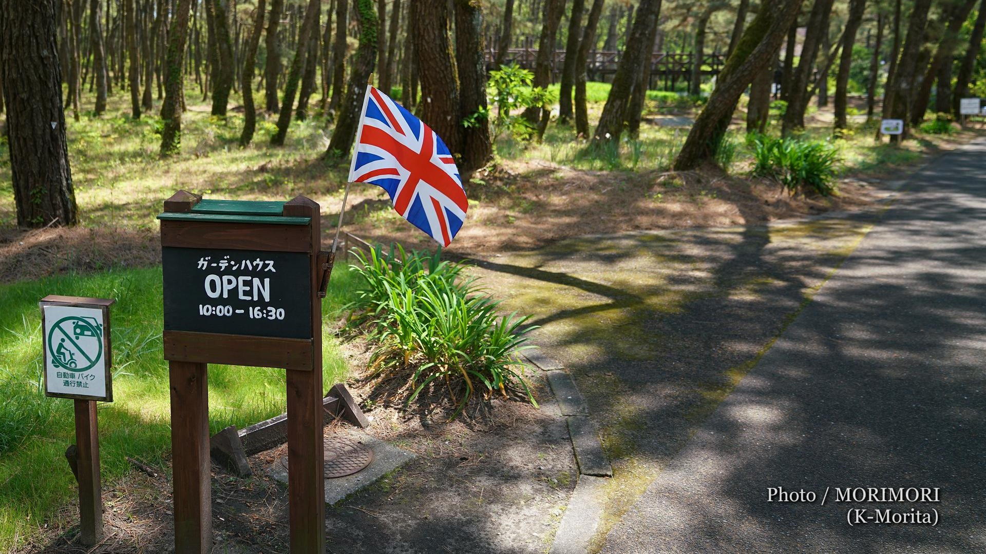 フローランテ宮崎側から松林の中を歩いて行くと、入り口にOPENを知らせる看板とユニオンジャックが・・。