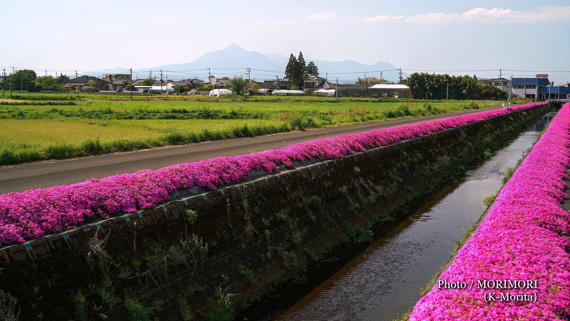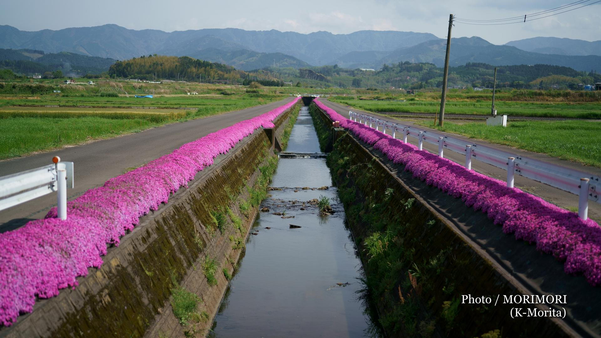 三股町、国道269号沿いにある、蓼池地区用水路沿いに咲き誇るシバザクラです。
