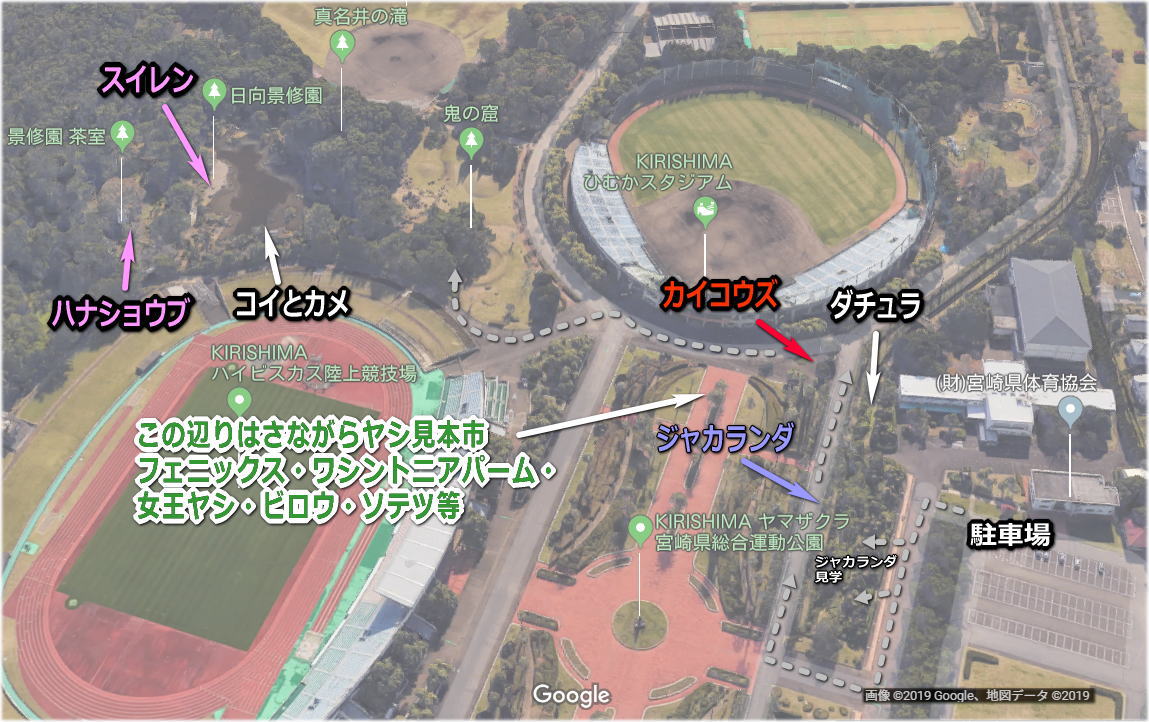 日本庭園へは・・車は、中央第二駐車場に駐車、ひむかスタジアムの前を通って歩いてすぐです。