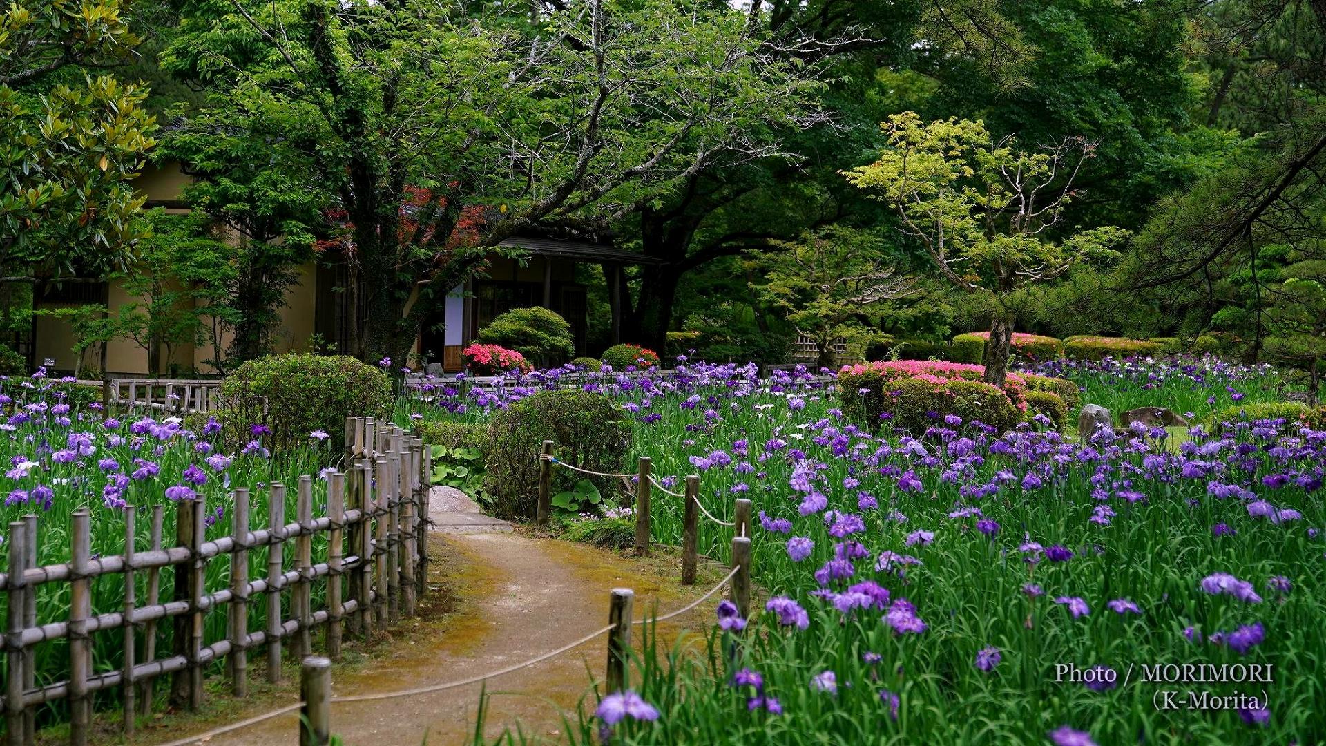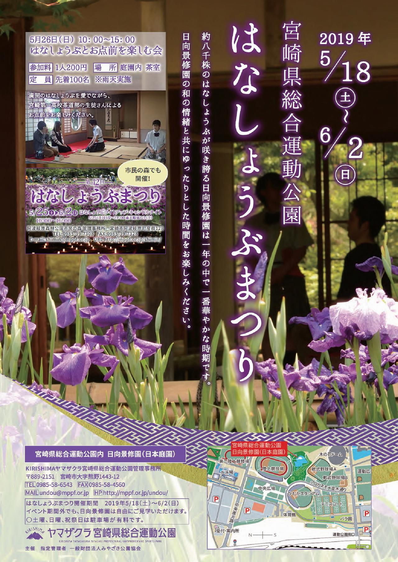 宮崎県総合運動公園内 日本庭園(日向景修園)の菖蒲(ショウブ)園ジャカランダの咲いている、同時期に、運動公園内にある日本庭園(日向景修園)の菖蒲園ではハナショウブが見頃となります。