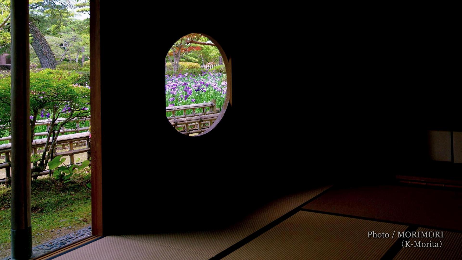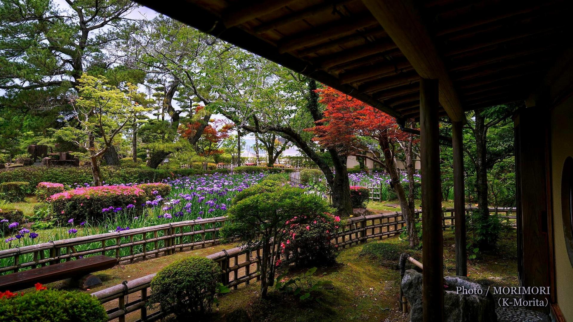 菖蒲園の中央には庭園の点景となる茶室があります。