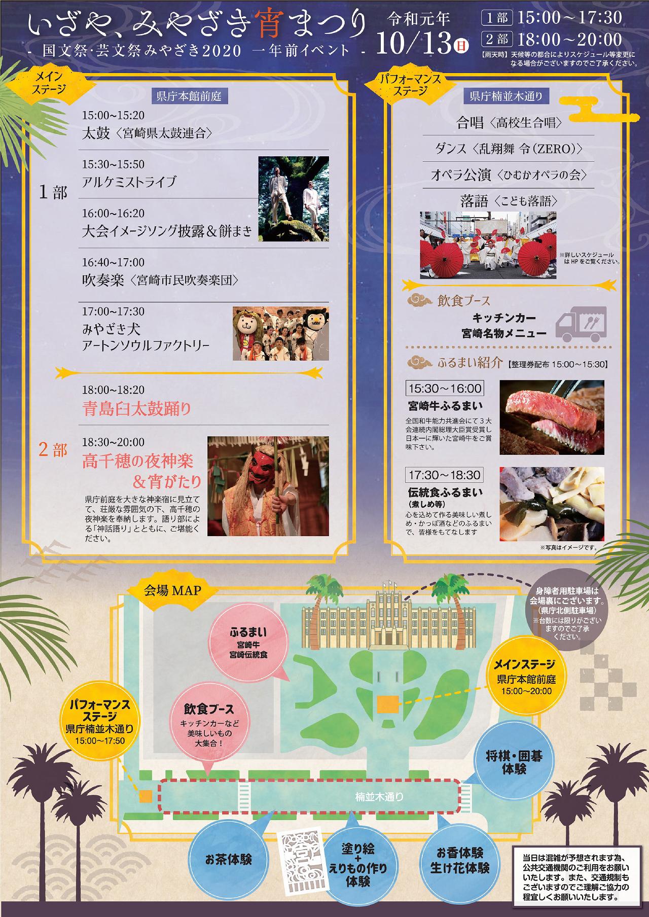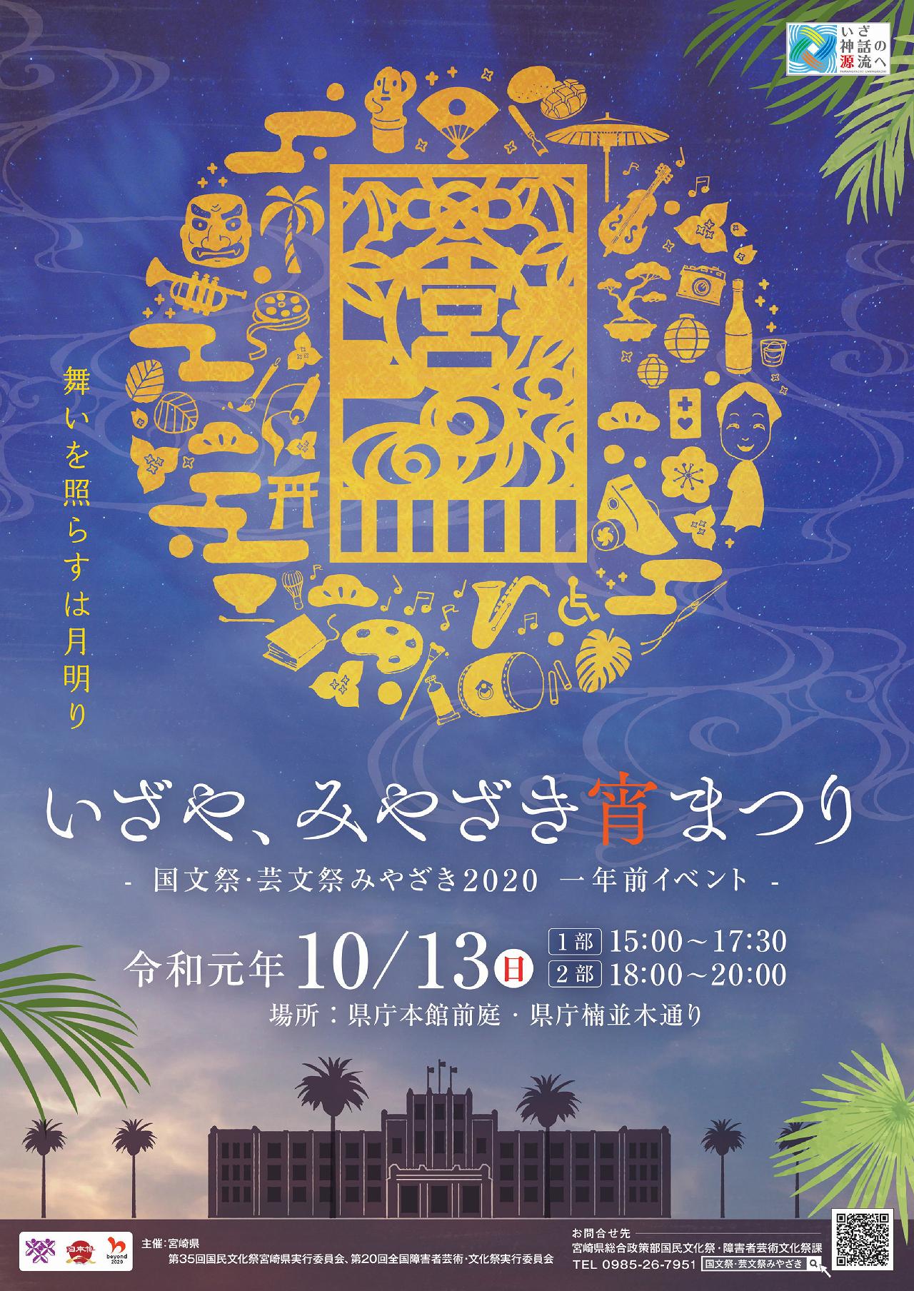 来年、宮崎県で開催される「国文祭・芸文祭みやざき2020」の関連イベントの一つとして「いざや、みやざき宵まつり」が、10月13日(日)宮崎県庁前庭・県庁楠並木通りで開催されるとのこと。