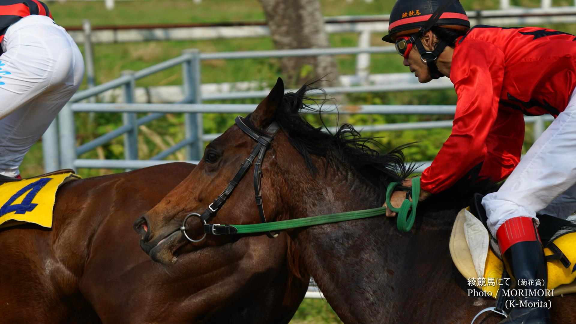 第8レース「綾城賞」を走る「アヤノウエモアヤノ」女性ジョッキー 吉永彩乃さん馬名もさることながら(現地では気づきませんでしたが)、写真をよくよく見ると、馬の前足、ジョッキーの髪の毛の色に至るまでコーディネイトされてますね。
