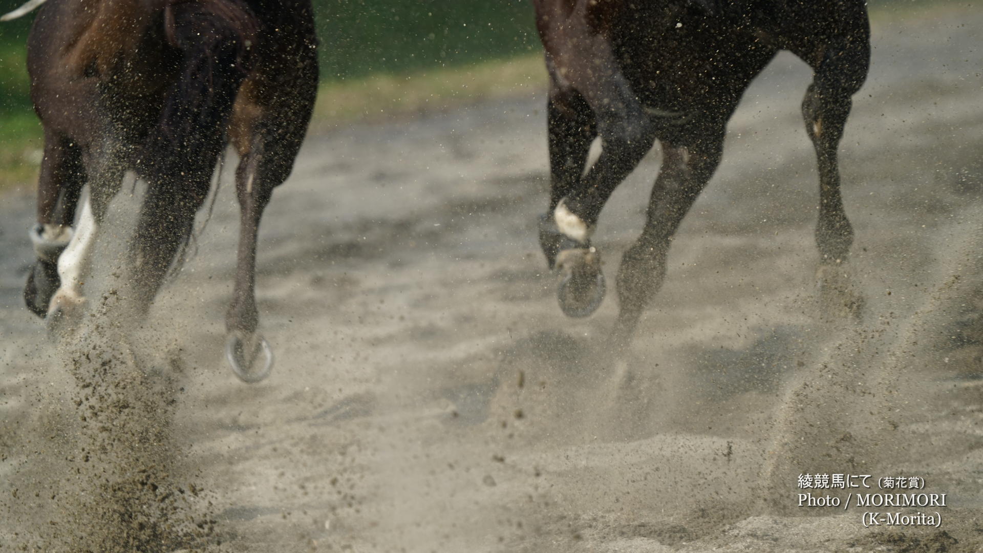 蹴散らした砂が騎手の頭上高く上がっています。(画像を拡大して見てください。)