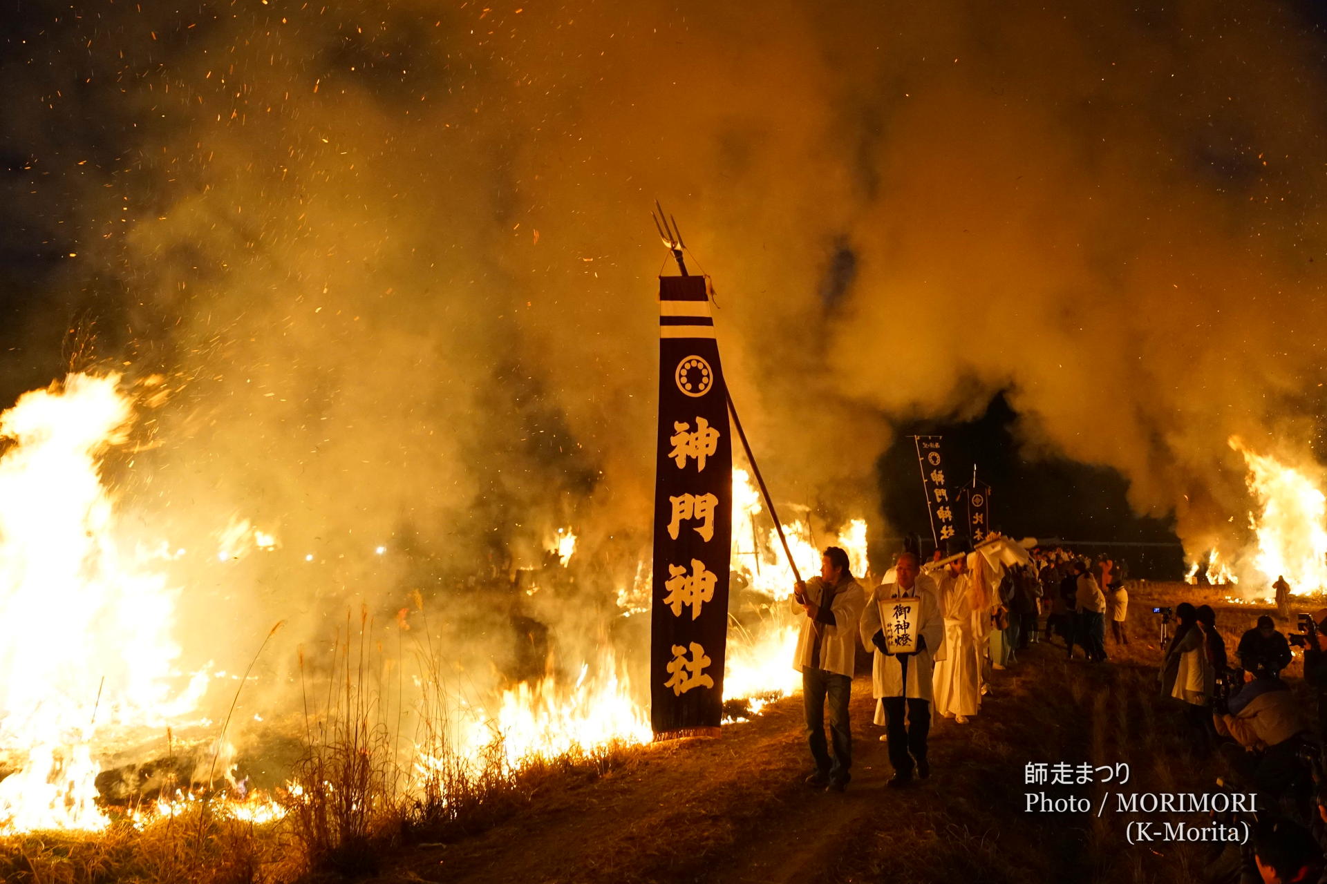 「塚の原」で神事を行った一行は、畑の中で燃え盛る「迎え火」の中を通り、神門神社へと向かいます。