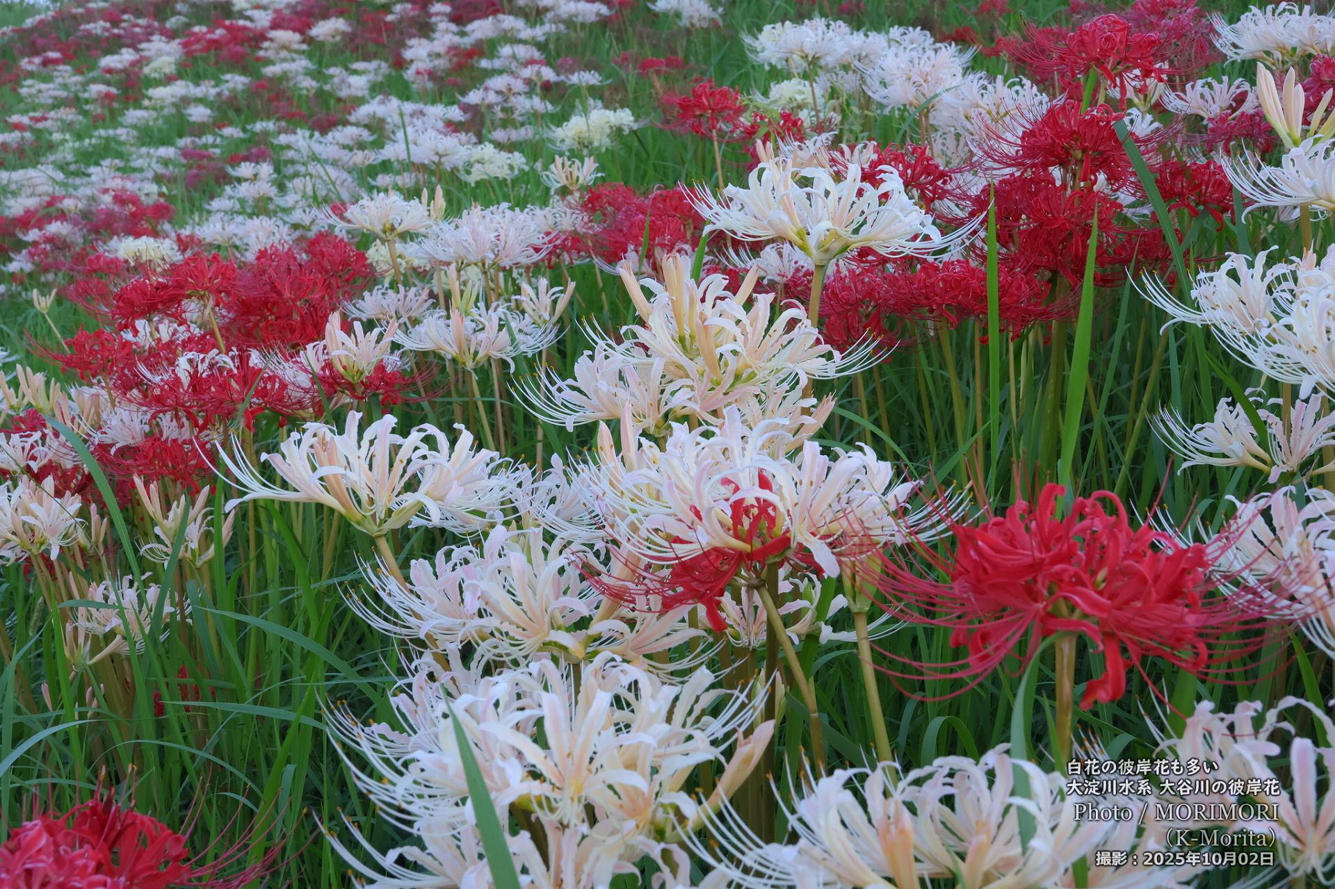 赤色の彼岸花は9月27日頃に見頃を迎えましたが、10月2日夕刻現在、白色の彼岸花が最盛期で、紅と白が丁度一緒に咲いている状況でした。