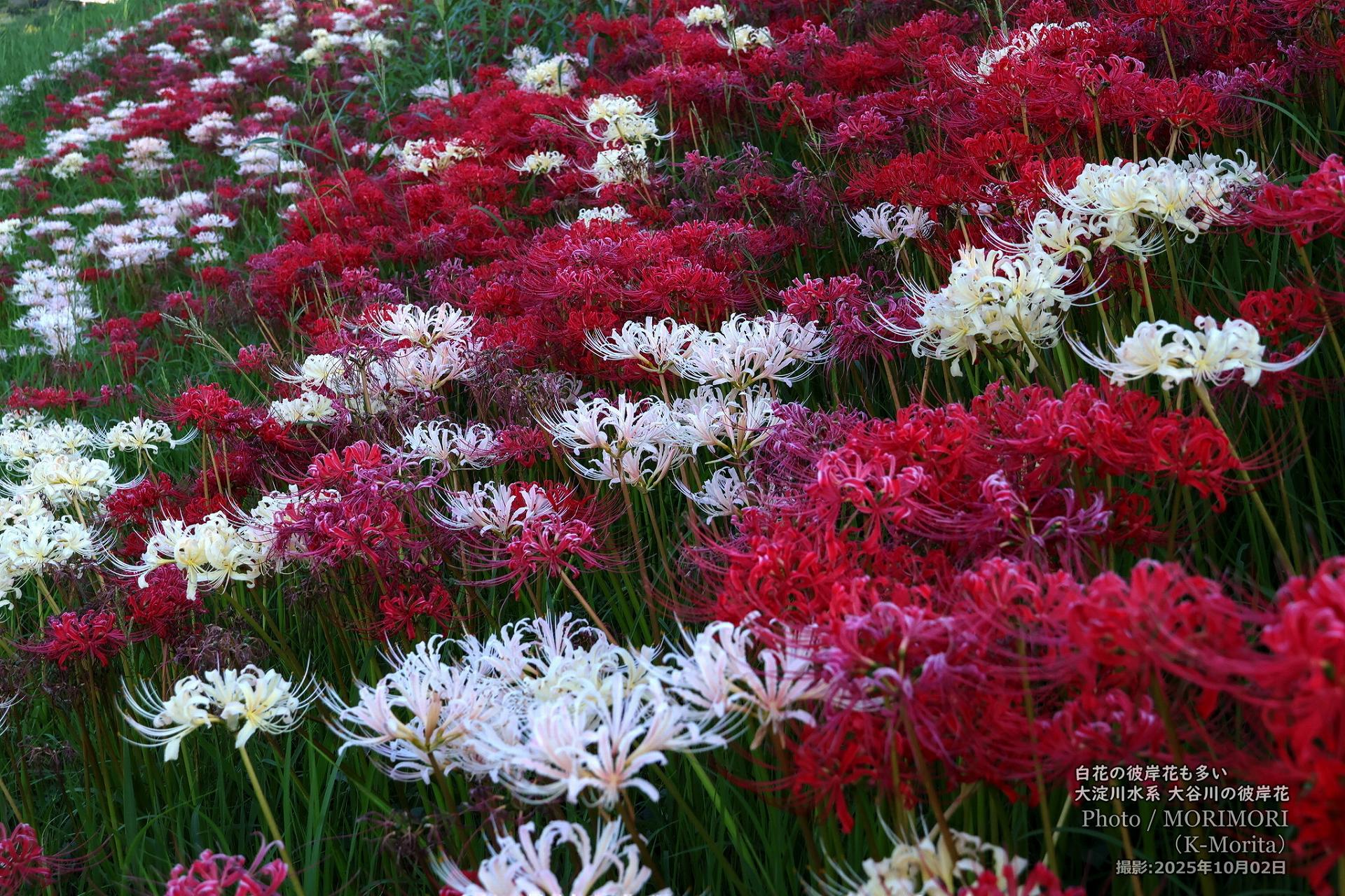 毎年見学に訪れている大淀川水系「大谷川」堤防の彼岸花が今年も紅白咲き揃いました。