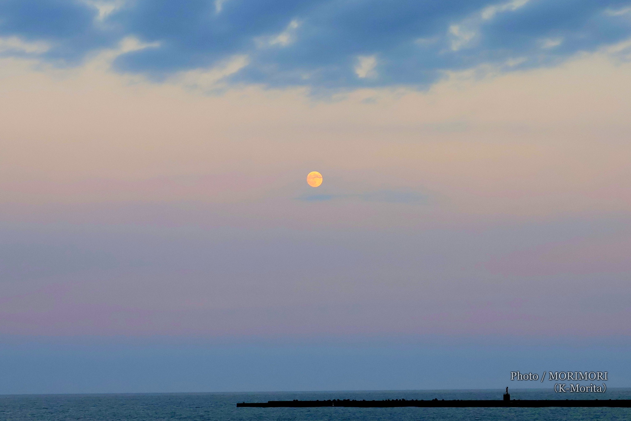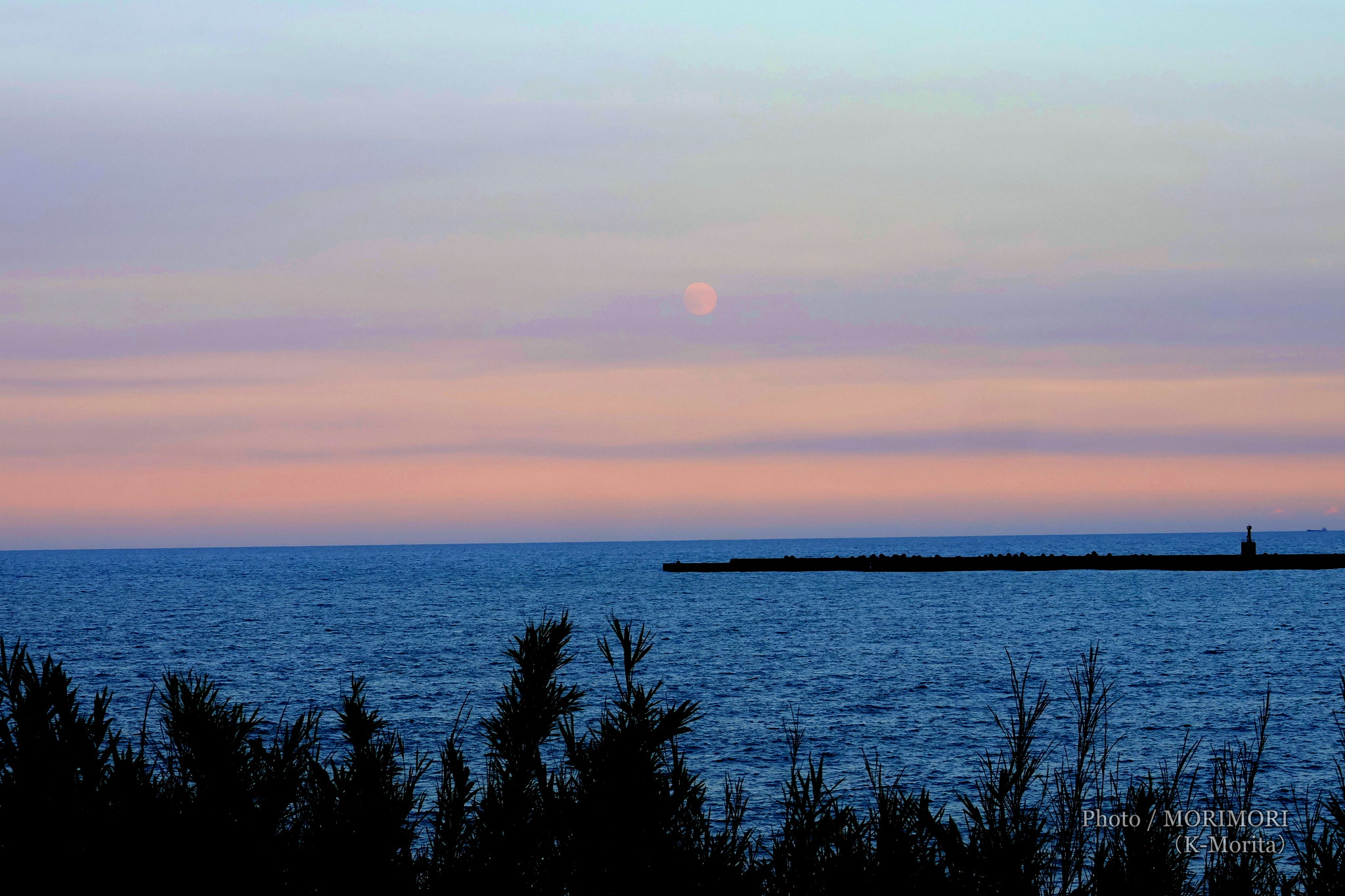しばらくして 水平線から少し上ったところに霞みがちに月がお出ましになった。
