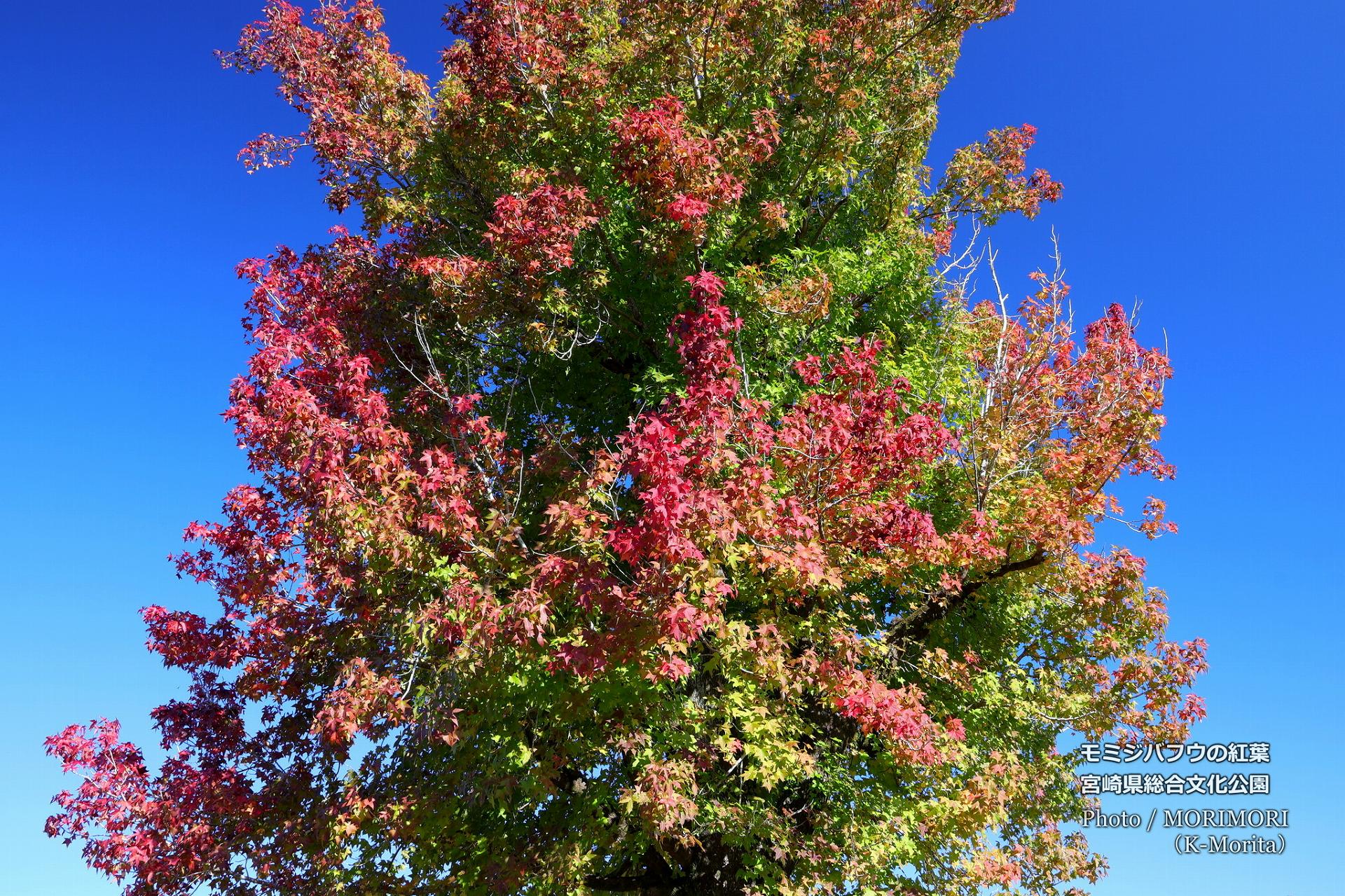 県立美術館・図書館・芸術劇場などがある、宮崎県総合文化公園の公園広場に大きくそび立つ「紅葉葉楓(モミジバフウ)」の巨木があり、現在、秋から冬へ備えるように、先日まで緑一色だったものが黄色そしてオレンジ色、赤へと日々姿を変えている。(11月23日撮影)