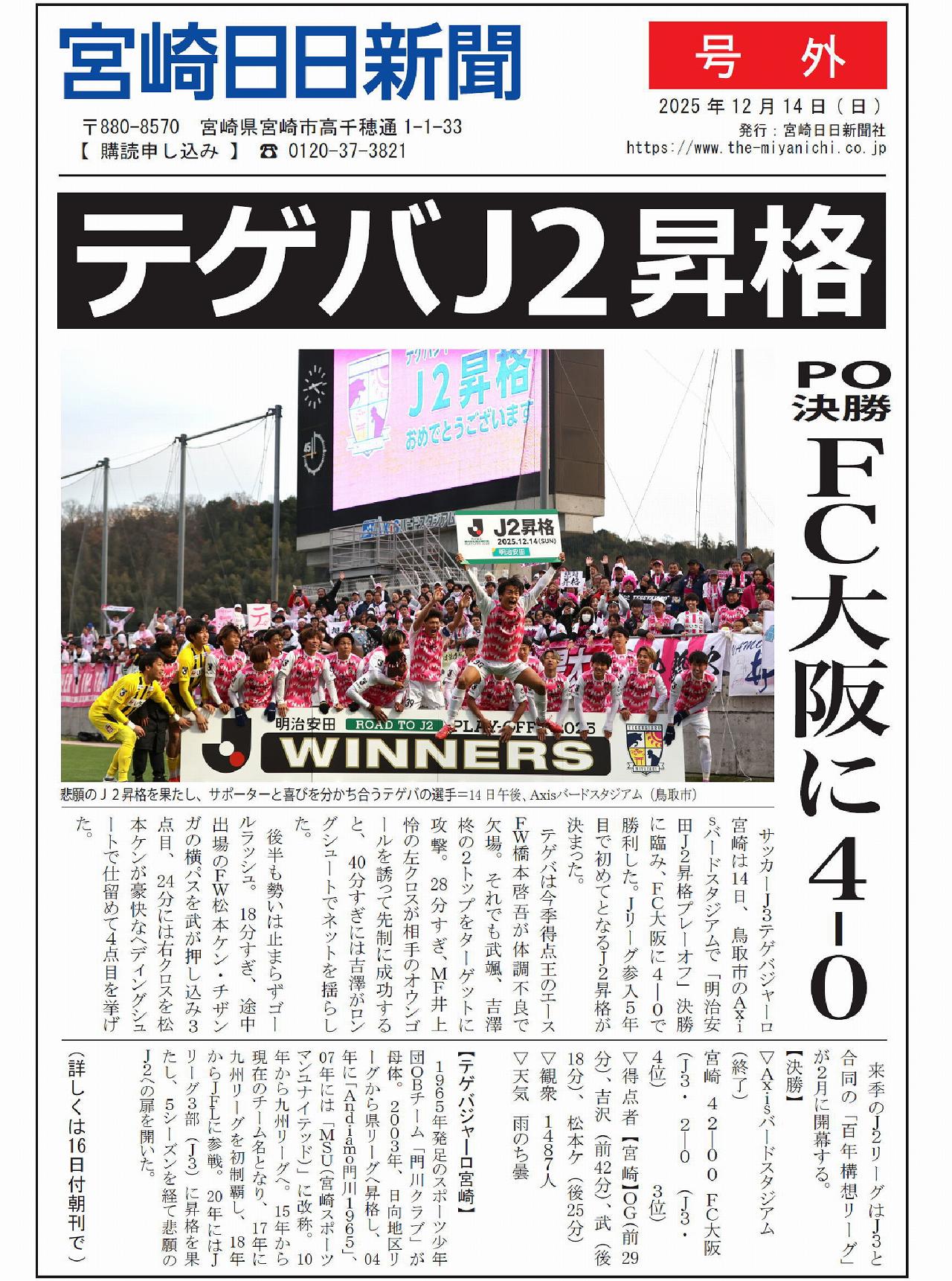 宮崎日日新聞より12月14日 号外が出ておりましたので記念掲載。