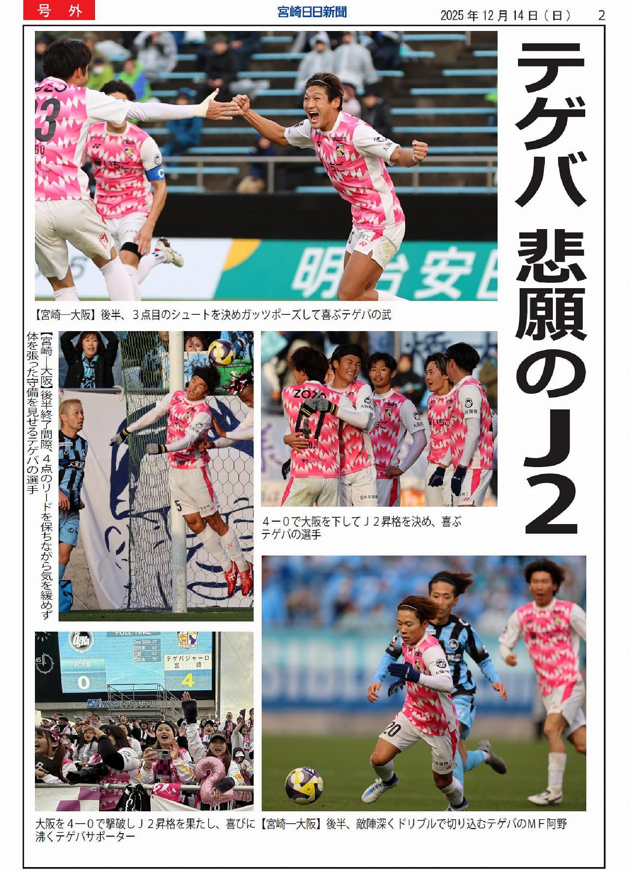 サッカーJ3テゲバジャーロ宮崎は14日、 鳥取市のAxisバードスタジアムで 「明治安田J2昇格プレーオフ」決勝に臨み、FC大阪に4-0で勝利した。Jリーグ参入5年目で初めてとなるJ2昇格が決まった。