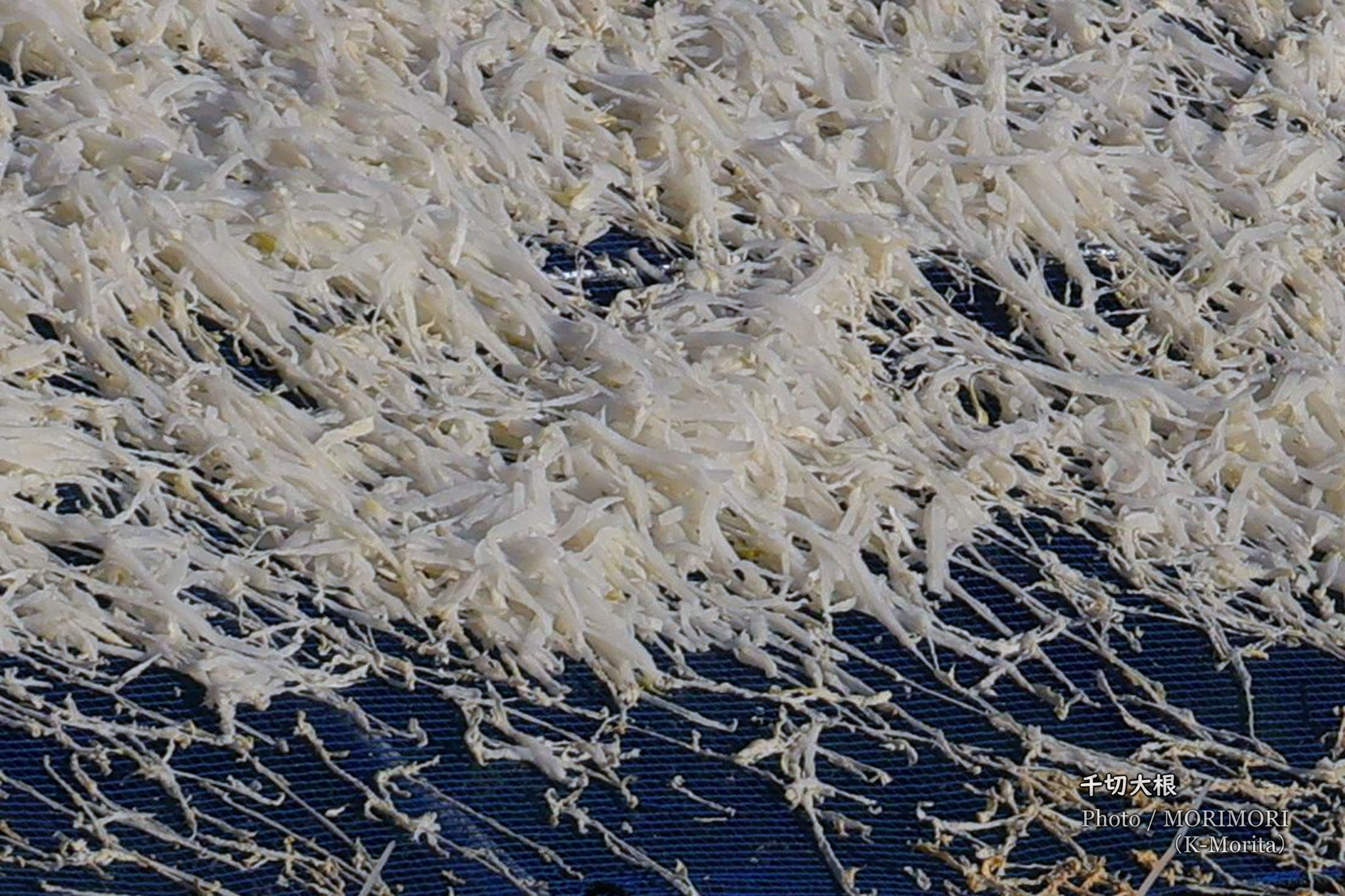 千切大根は、トラクターで牽引した台車に積んだ大根を、加工機でその場で千切りにして網へ吹付けます。その後、一人が、熊手のようなもので満遍なく干し網へ広げるて行く作業を行います。