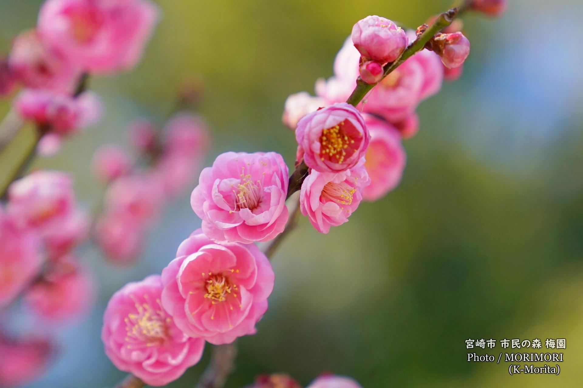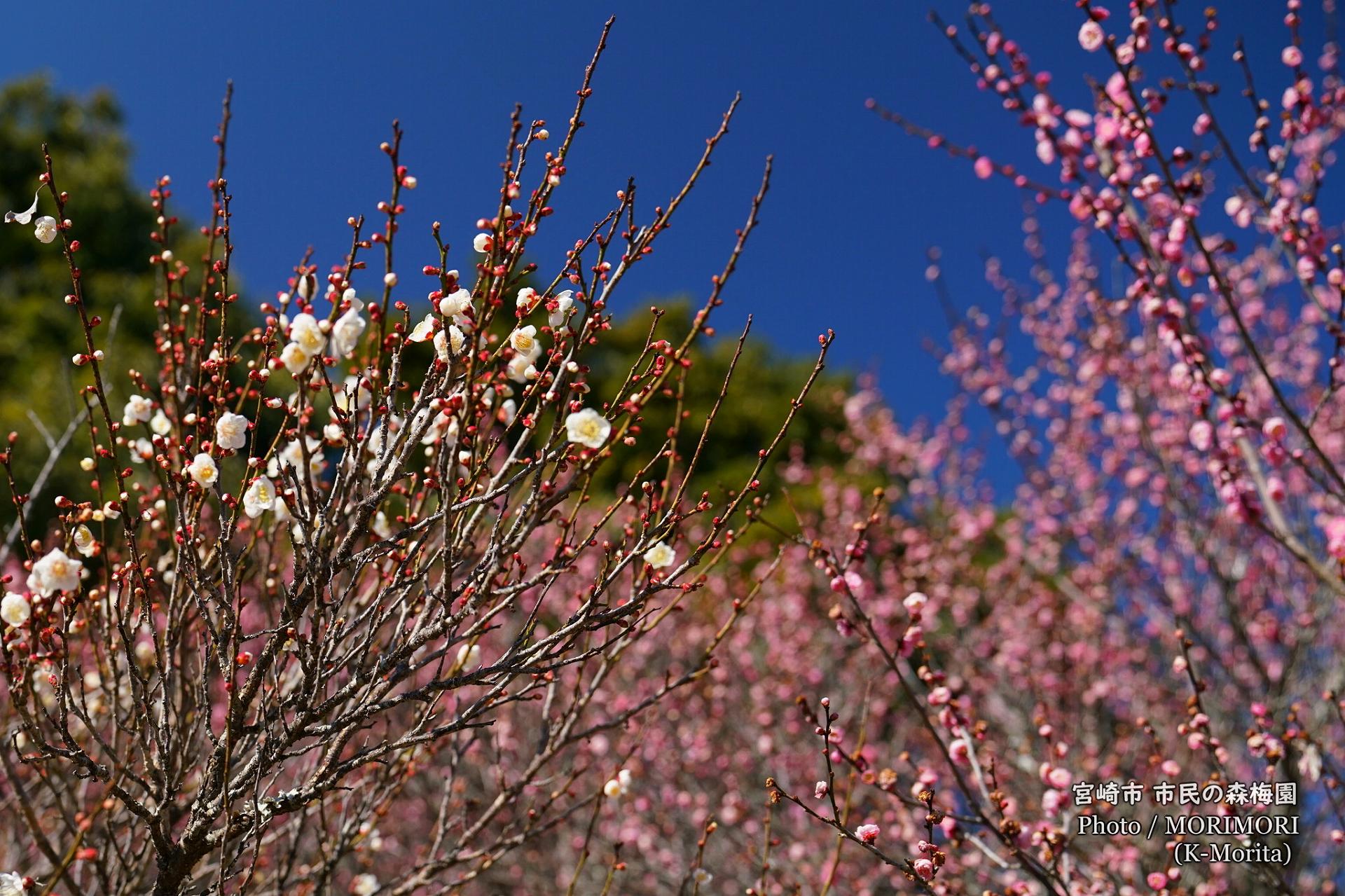 宮崎市・ 阿波岐原森林公園 市民の森には、公園南側に梅園があり、1月末頃より2月初旬に見頃となります。梅園内には白、赤、桃色、160本程の梅の木があり、「春の訪れ」を教えてくれます。