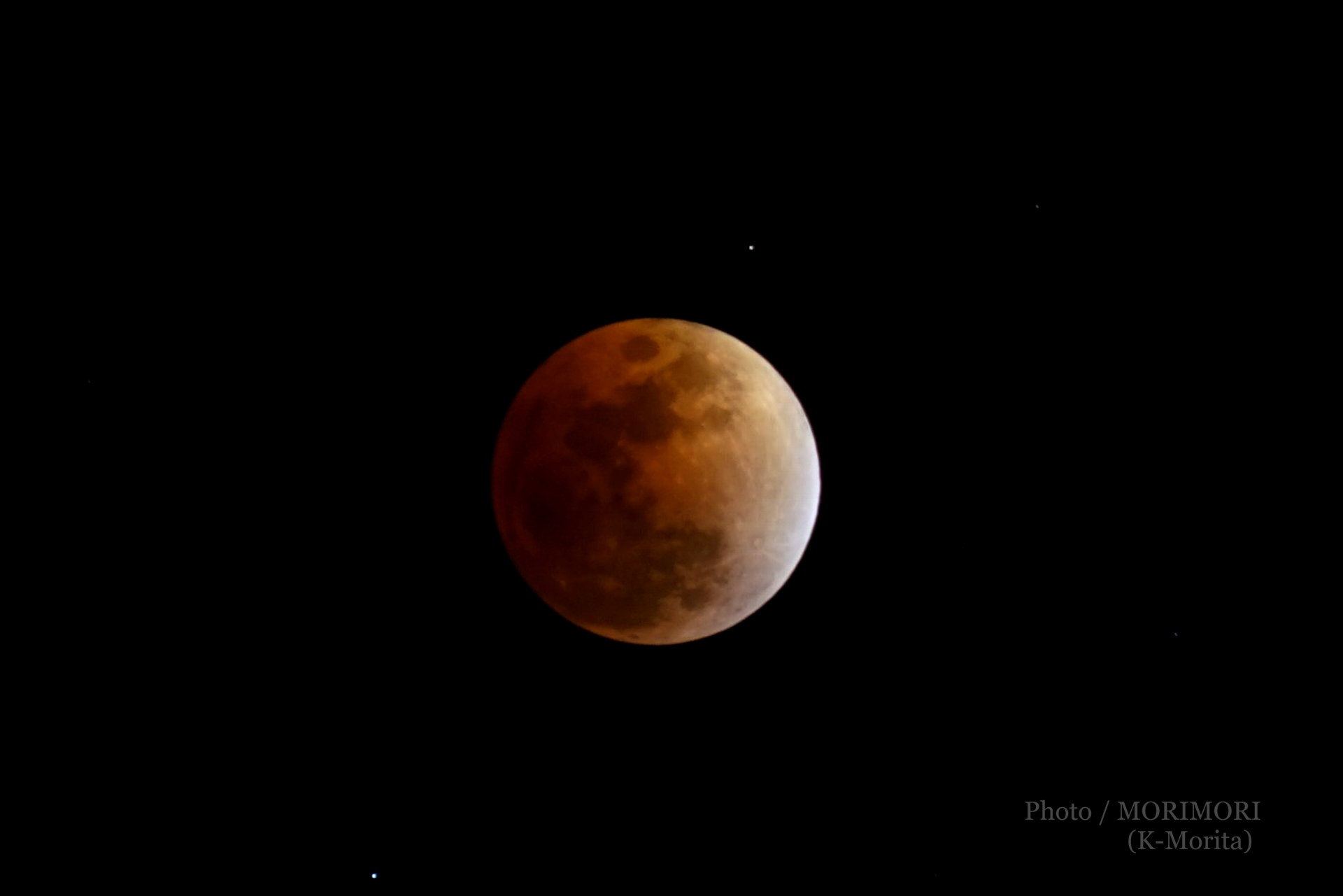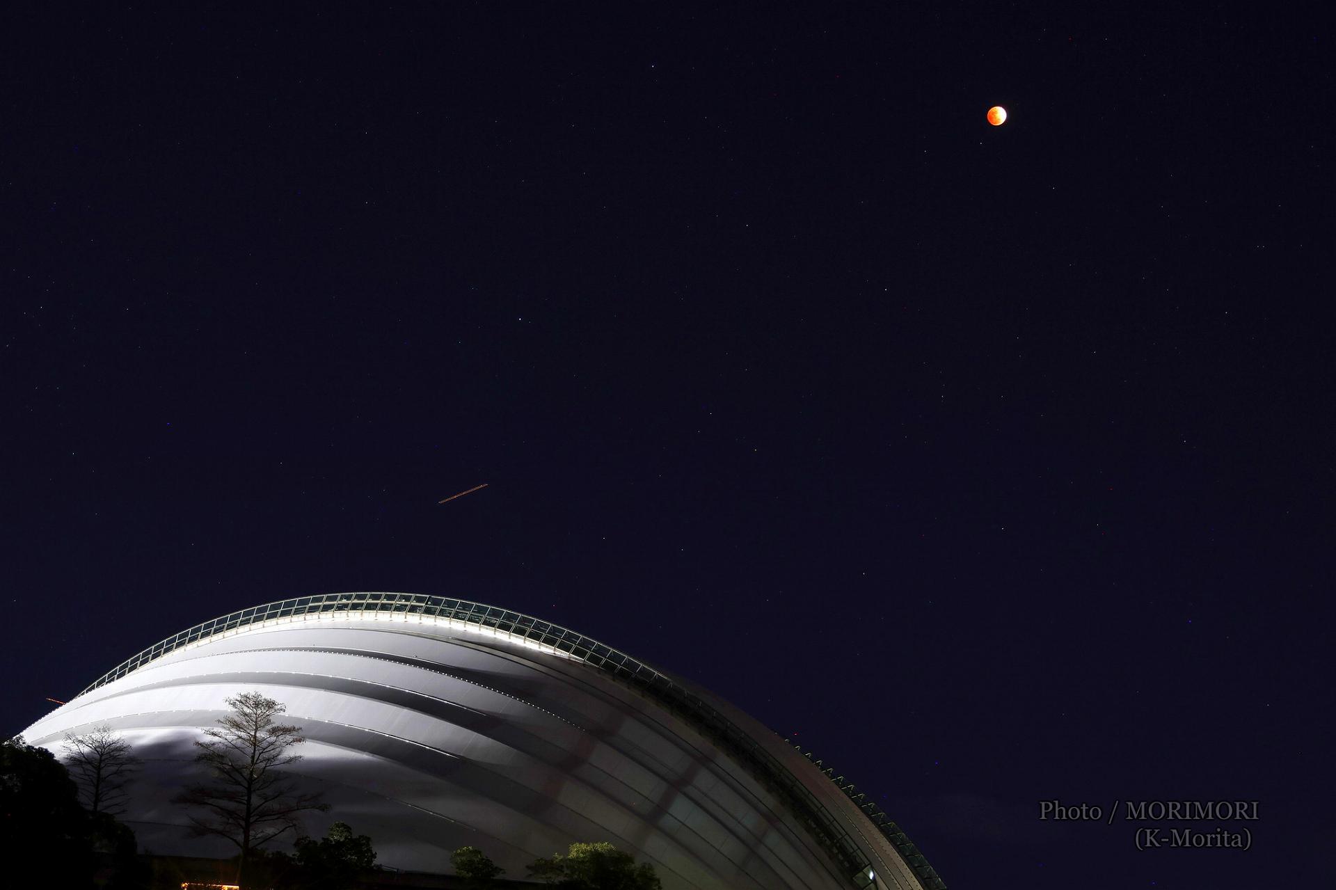 満月なのですが、皆既月食で普段よりかなり暗いので光は地上を照らさず周囲は真っ暗闇、月が出ているのにも関わわらず星が輝き綺麗でした。はるか上空を飛ぶ航空機も映っておりました。