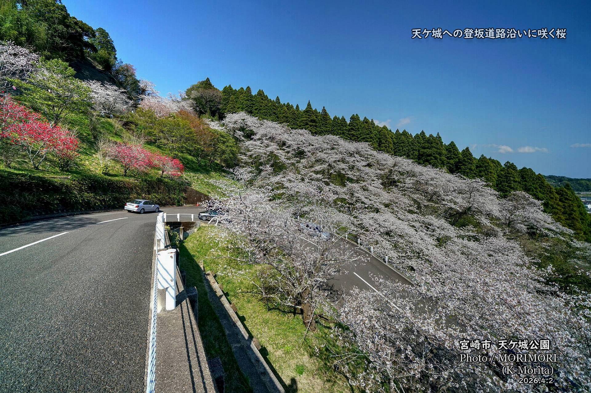 宮崎市高岡町 天ケ城公園の桜も満開、上りの道路沿いの桜