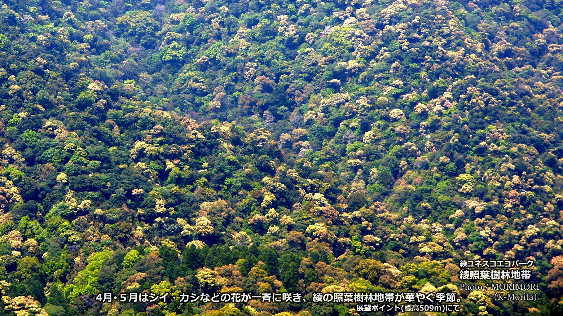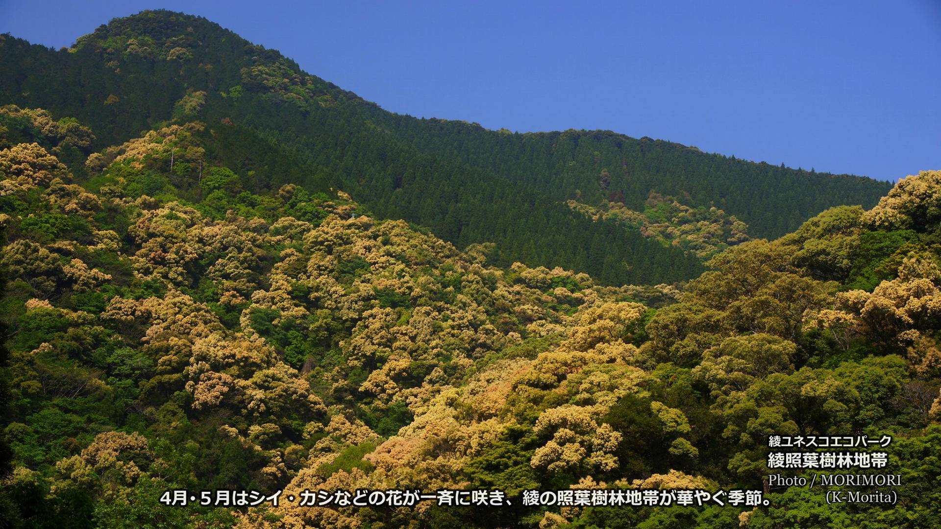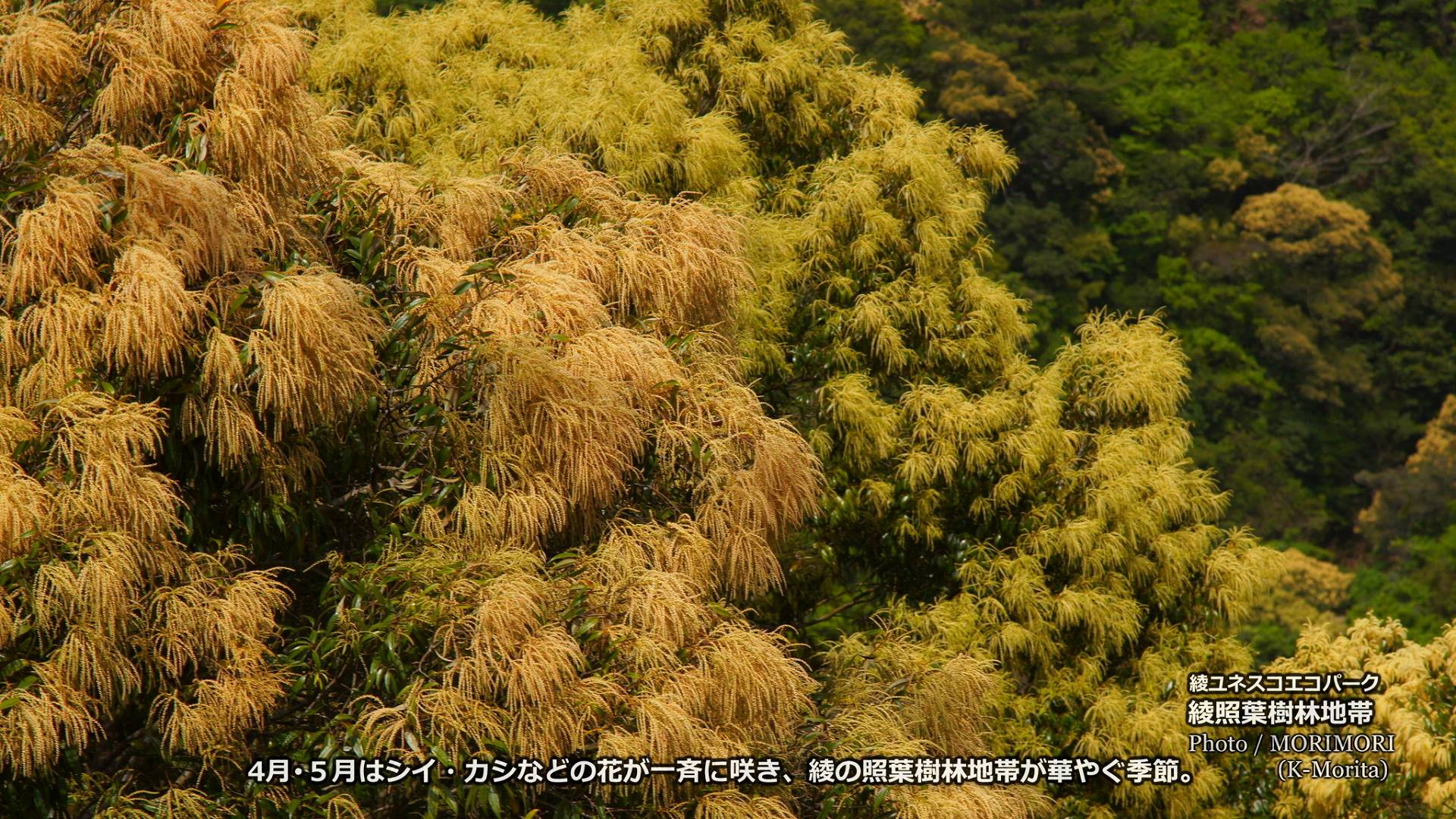 シイ、カシなどの照葉樹は4月中旬頃よりいっせいに開花し、新緑と共に綾の山全体が盛り上がったようにも見え、モコモコした木々はあたかも新緑はブロッコリー、開花した照葉樹はカリフラワーにも見えます。