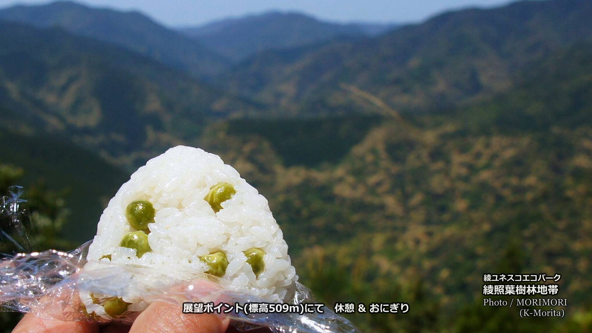 照葉樹林展望コース 展望ポイント(棒標高509m)で休憩・おにぎり