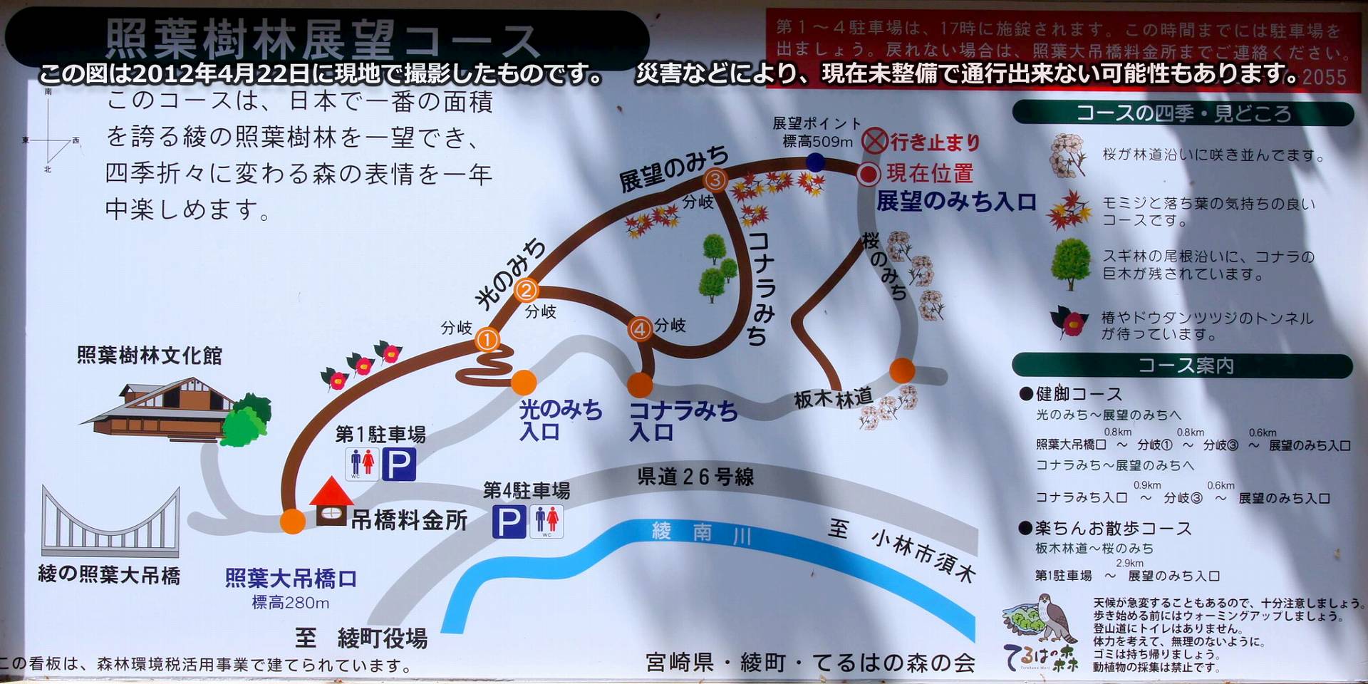 2015年4月に撮影したもので、その後、台風などでの被害などもあったようですので、現在の状況は未確認です。綾照葉大つり橋の駐車場から「板木林道」を2キロ程歩けば行けそうですが、整備され視界が確保出来るのかは?不明です。