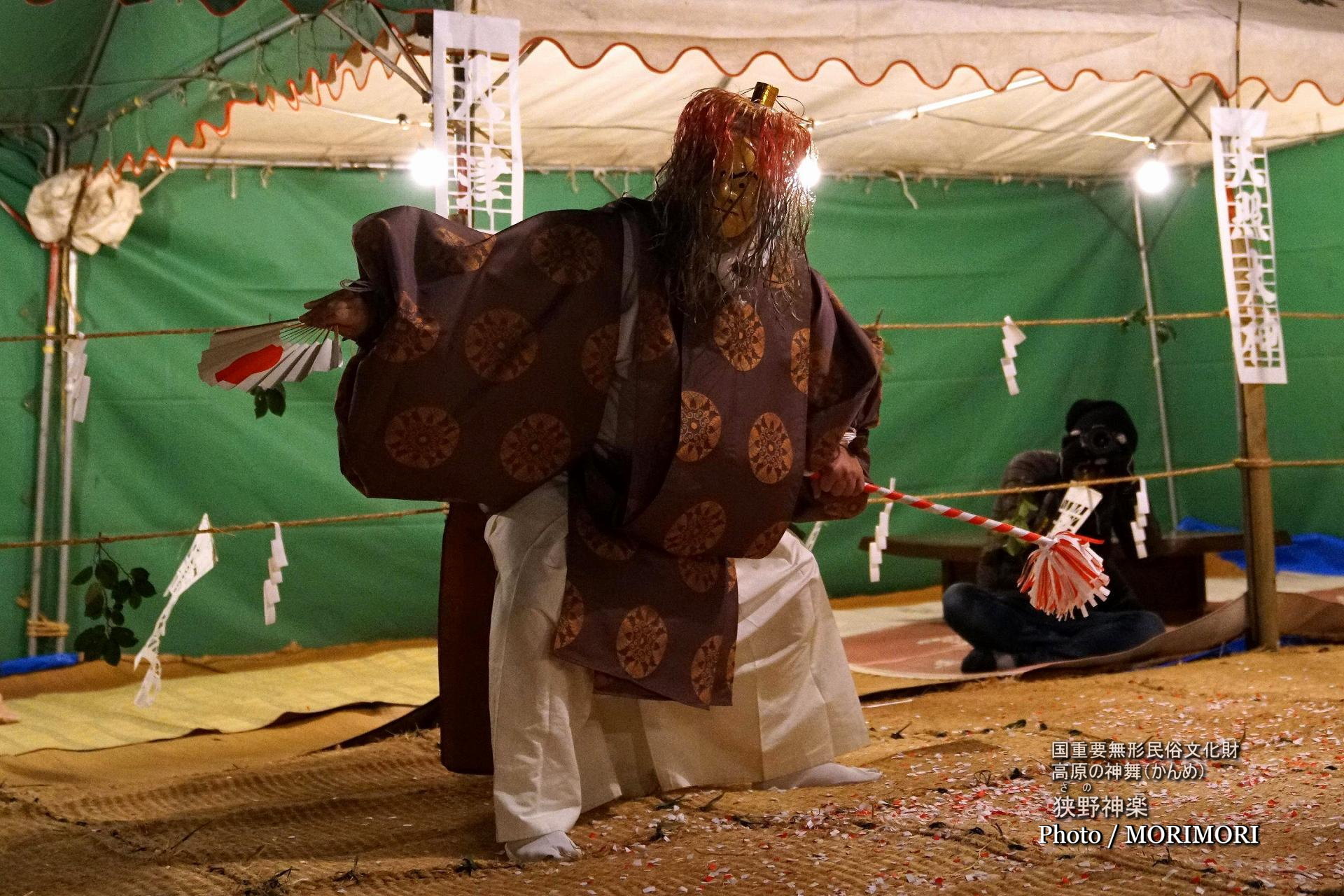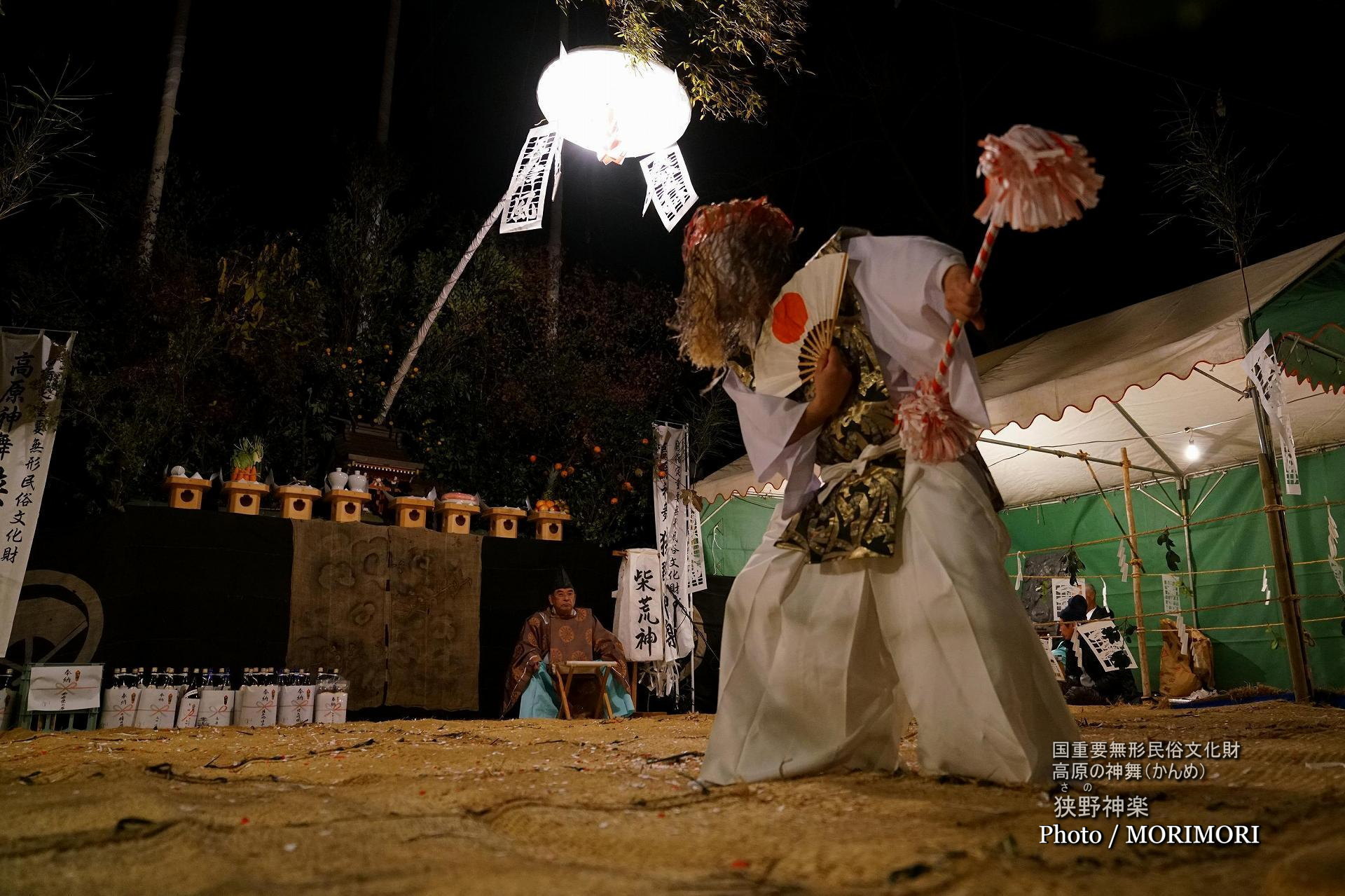 鬼神の1人舞。毛笠・黒狩衣・白衣・白袴・白足袋姿で、右手に扇子・左手に藤の鞭を持つ。