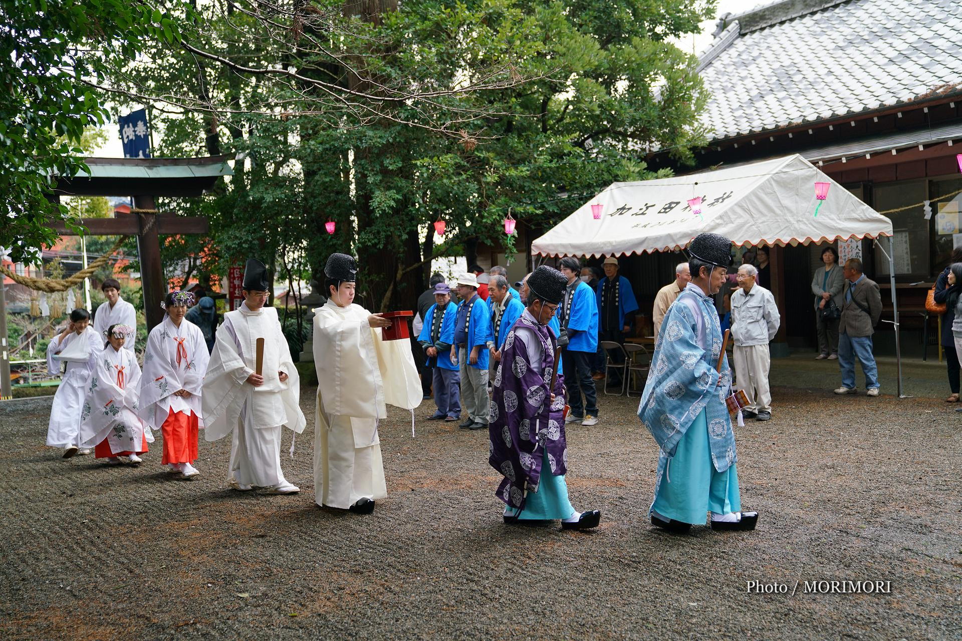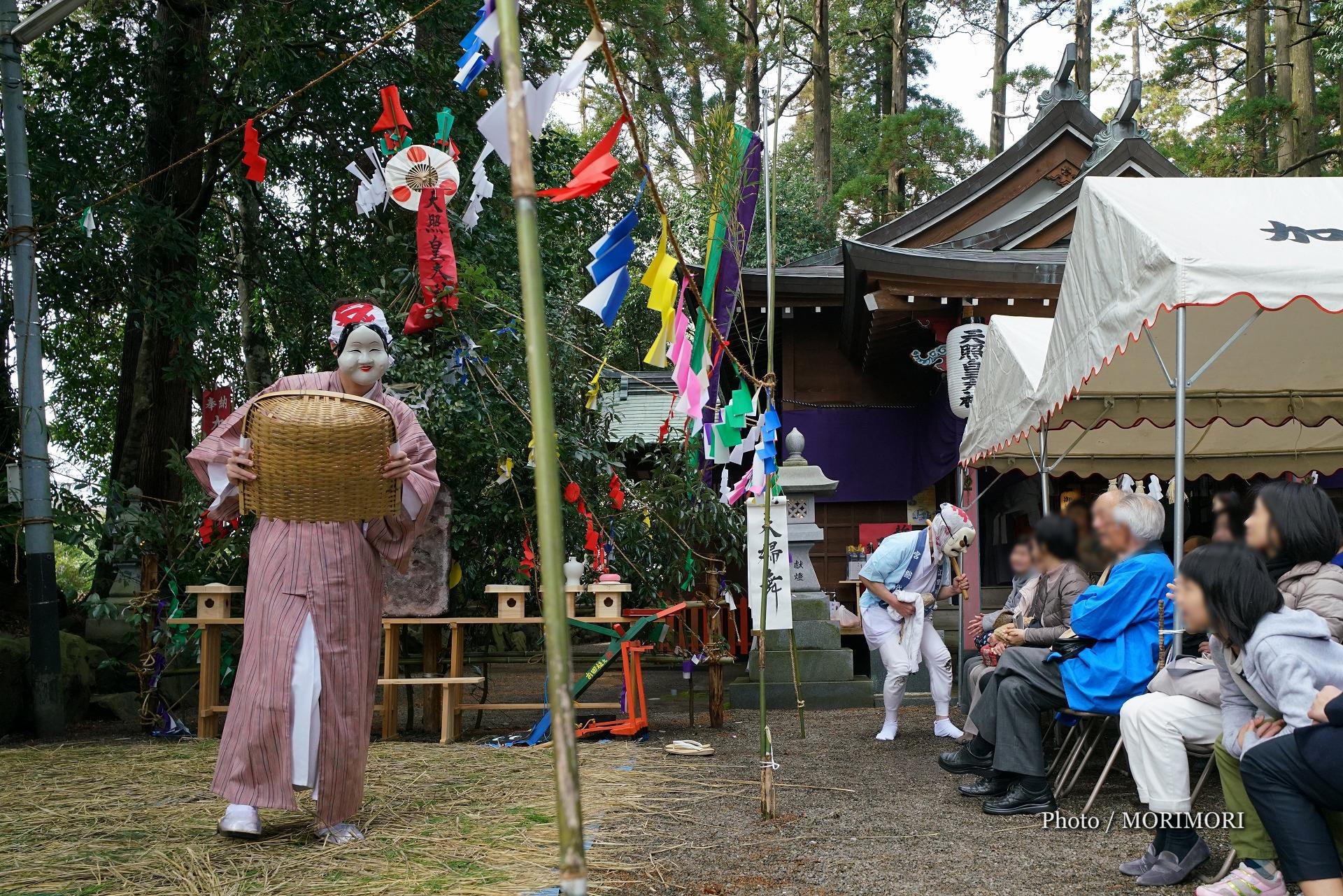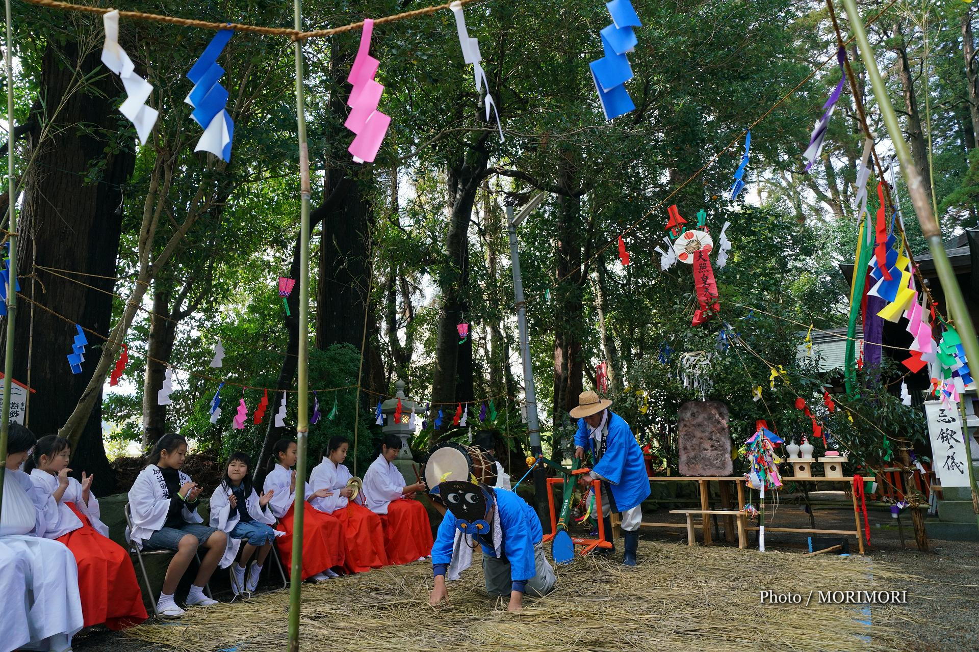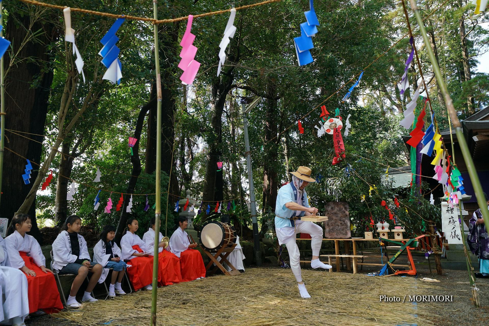 毎年、春の例大祭で五穀豊穣を祈願して舞われております。一時は舞手が一人になってしまい、廃絶の危機にあったそうですが、平成19年から地元の子供たちへの指導にあたるなど継承に努め、平成25年10月15日には伊勢の式年遷宮で奉納されました。