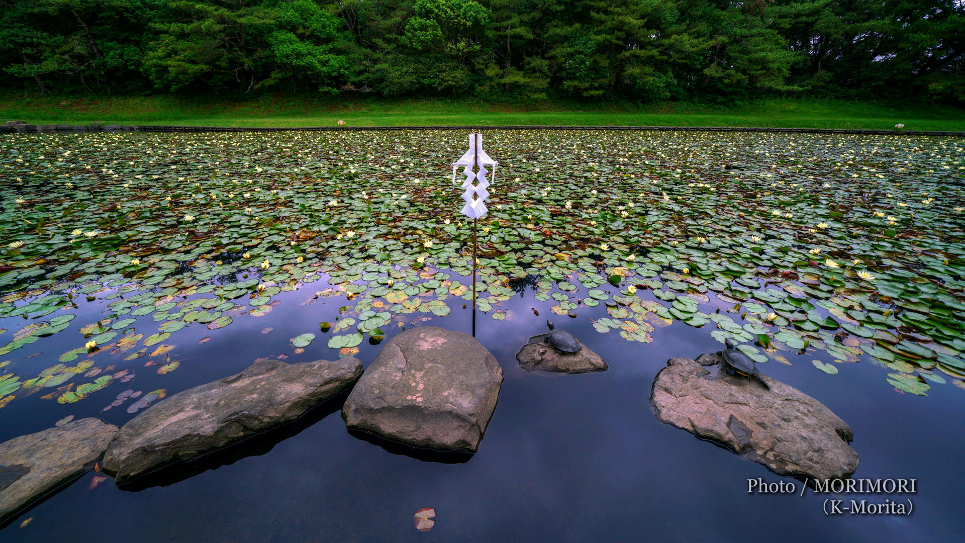 スイレンの品種はセントルイス。宮崎市が植栽したもので、延べ約4,000本が咲き誇り、神秘さに花をそえています。