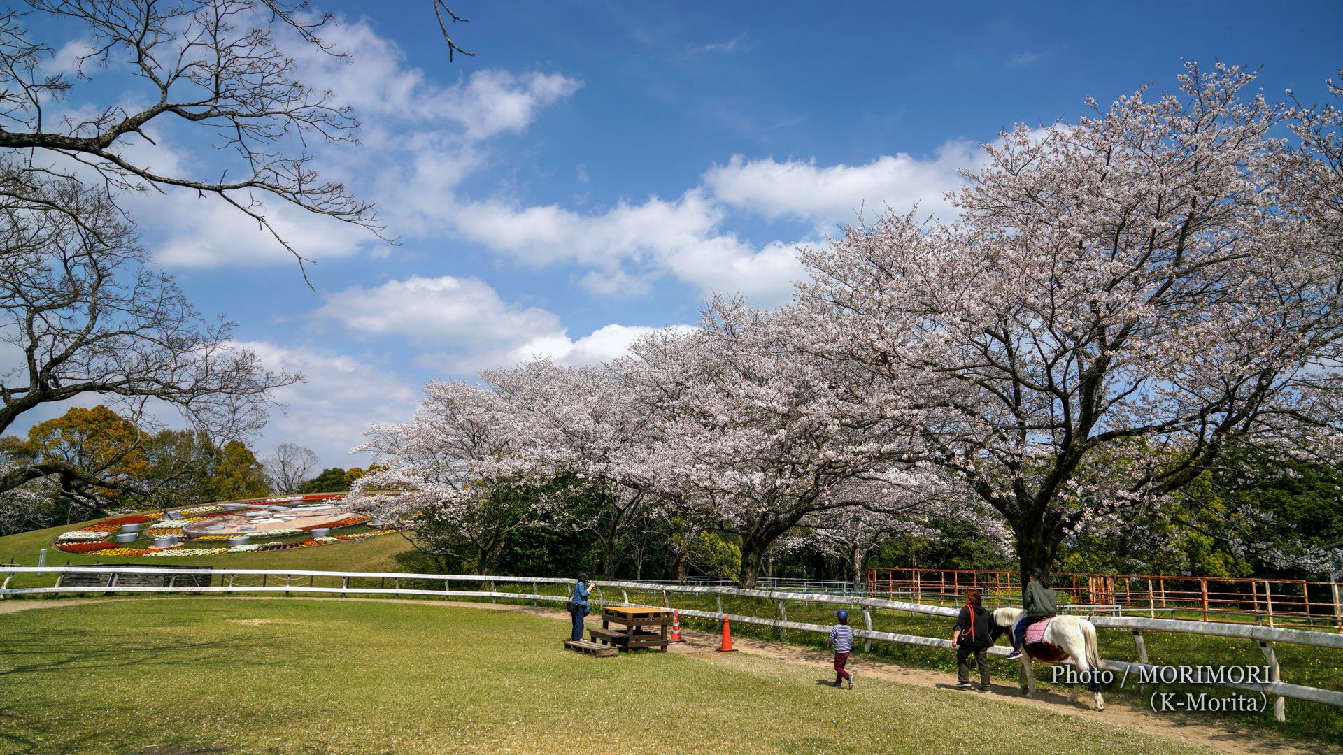 綾町 馬事公苑の桜(放牧場での引き馬体験)