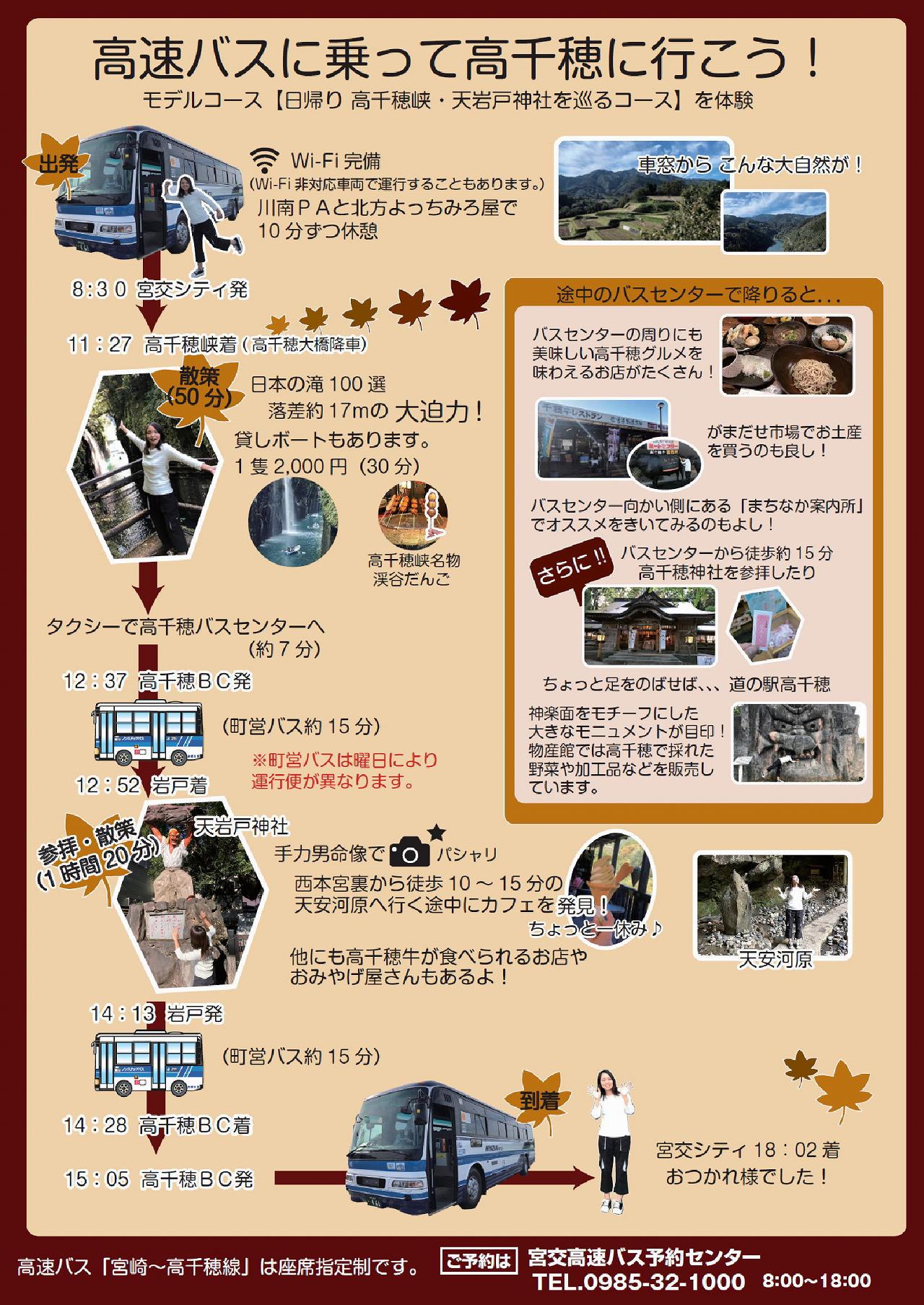 宮崎発宮交シティ(8:30)→ たまゆらの湯(8:35)→ 宮崎駅(8:40)→ 山形屋前(8:43)→ 県病院前(8:46)→ 大工町(8:48)→ 宮崎BS(8:57)→ 延岡IC(10:25)→ 高千穂バスセンター(11:22)→ 高千穂神社前(11:25)→ ホテル高千穂前(11:26)→ 高千穂大橋(11:27)